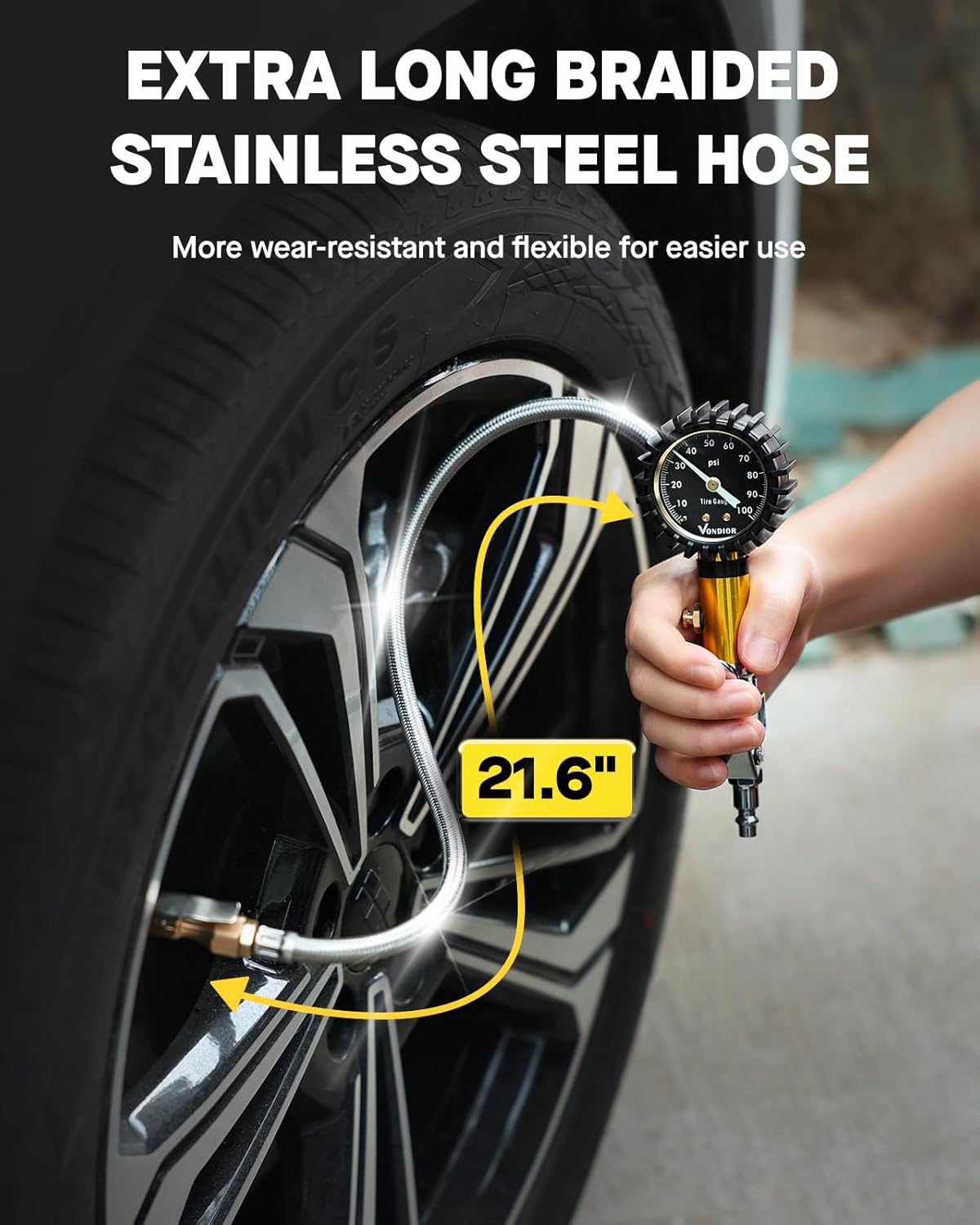 Vondior Tire Inflator with Pressure Gauge(0-100 PSI) - ANSI B40.1 Accurate, Large 2" Glow Dial, Premium Braided Hose, Durable Rubber Hose, Perfect for Any Car, Truck, Motorcycle, RV