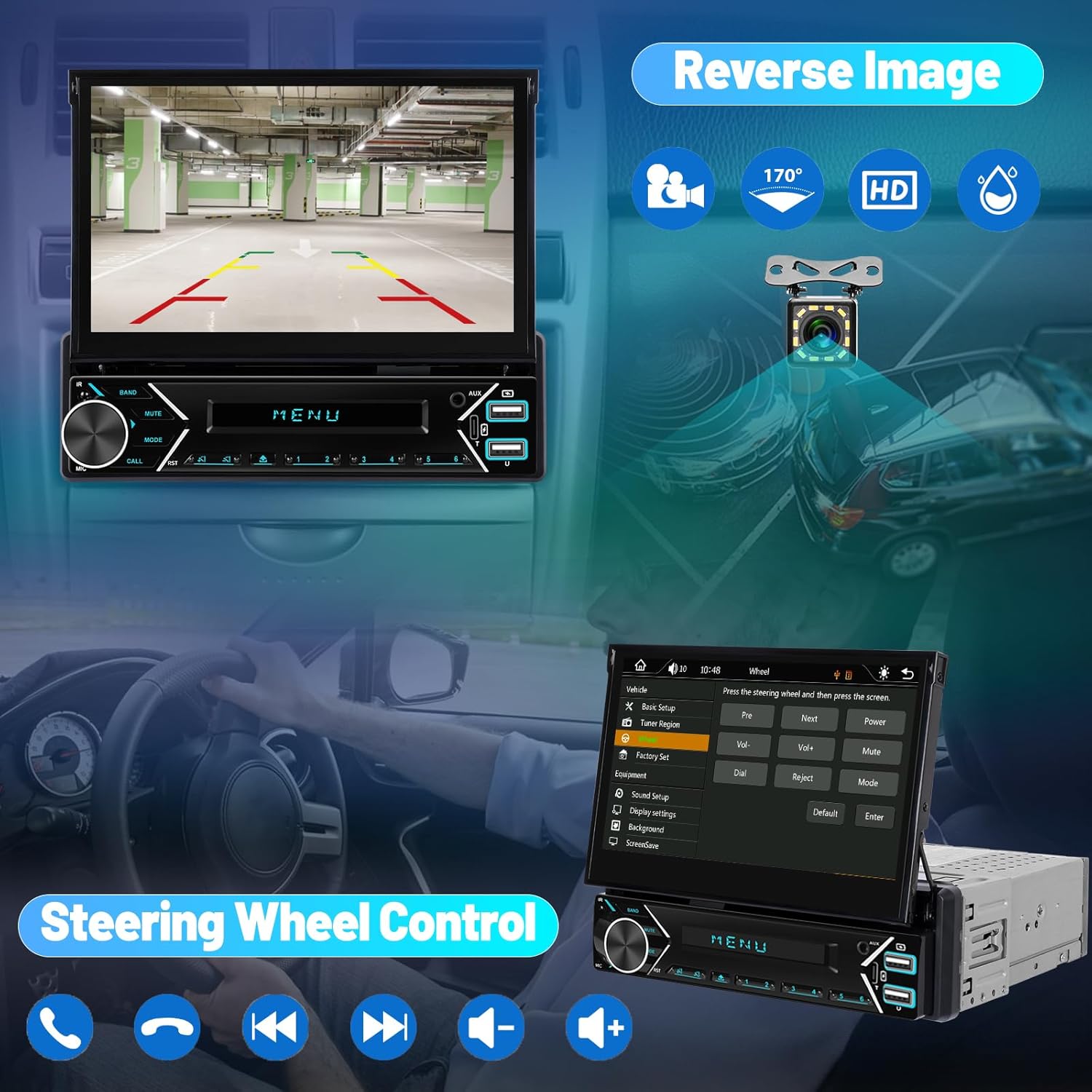 - Automatic 7Inch Flip Up Touchscreen: The single din car radio features a 7 inch motorized foldable screen that allows the users to easily to flip out or back in the screen. The carplay car radio supports 1080P video playback, giving you a pleasant viewing experience. Supports 7 colour lights, comes with 2 USB ports and a Type-C port, AUX port.