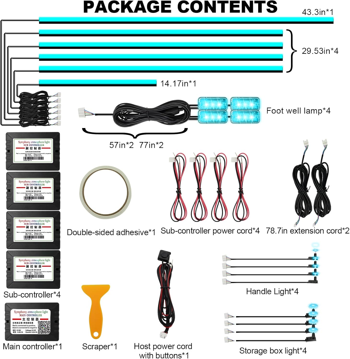 - 🚚Car Ambient Light Design: AMKI car led lights includes 6 acrylic fiber optic light strips (1*14inch+4*29.5inch+1*43inch, with 593 LEDs), 4 under dash lights, 4 door handle light, 4 door storage box light, 4 woofer lights, one master controller and 4 slave controller, all required installation tools are included, easy to install,without worrying about exposed wiring or an untidy look.
