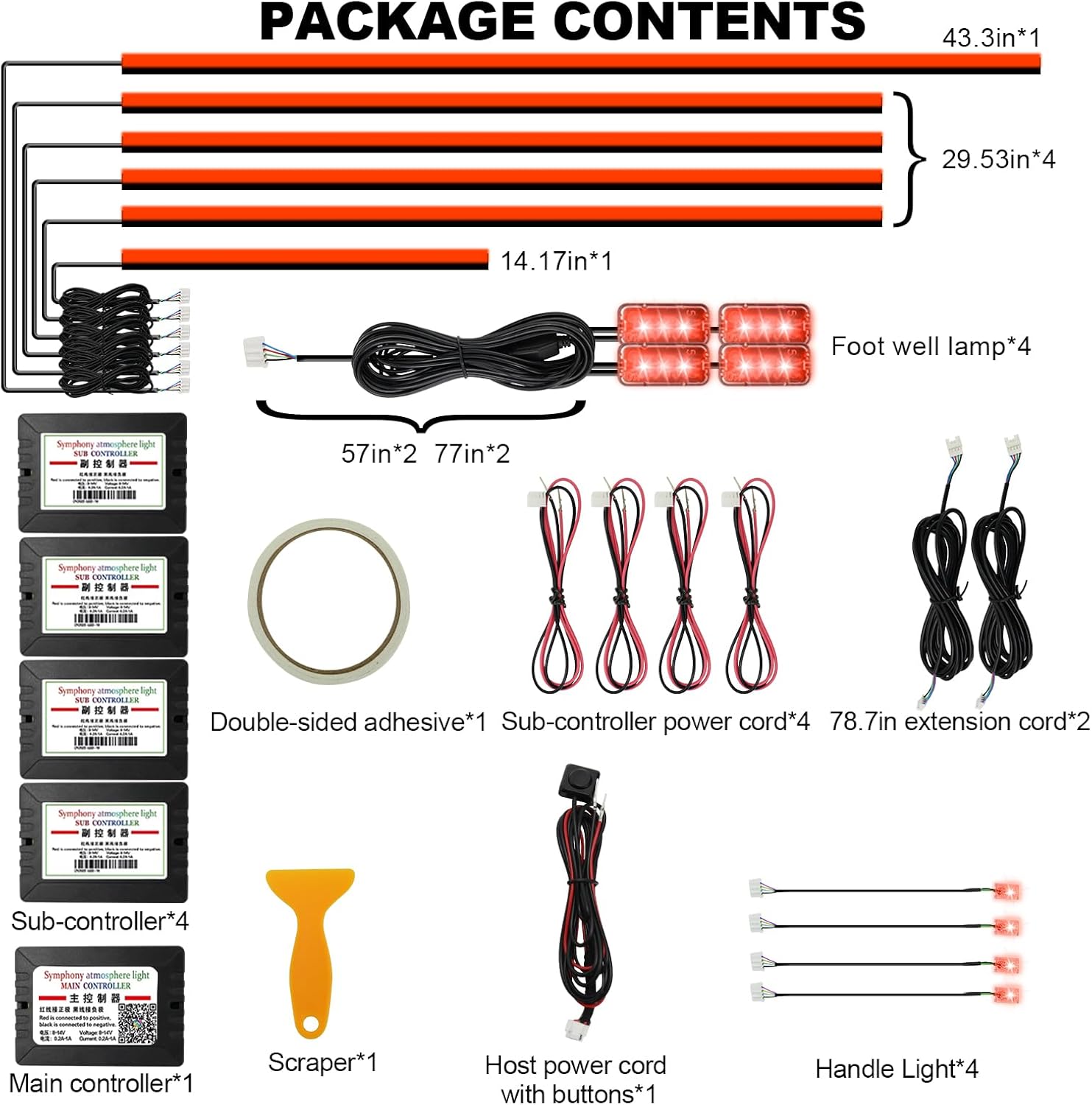 - Included Components : 6 acrylic fiber optic light strips, 4 under dash lights, 4 door handle lights, one master controller, 4 slave controllers, and required installation tools 6 acrylic fiber optic light strips, 4 under dash lights, 4 door handle lights, one master controller, 4 slave controllers, and required installation tools