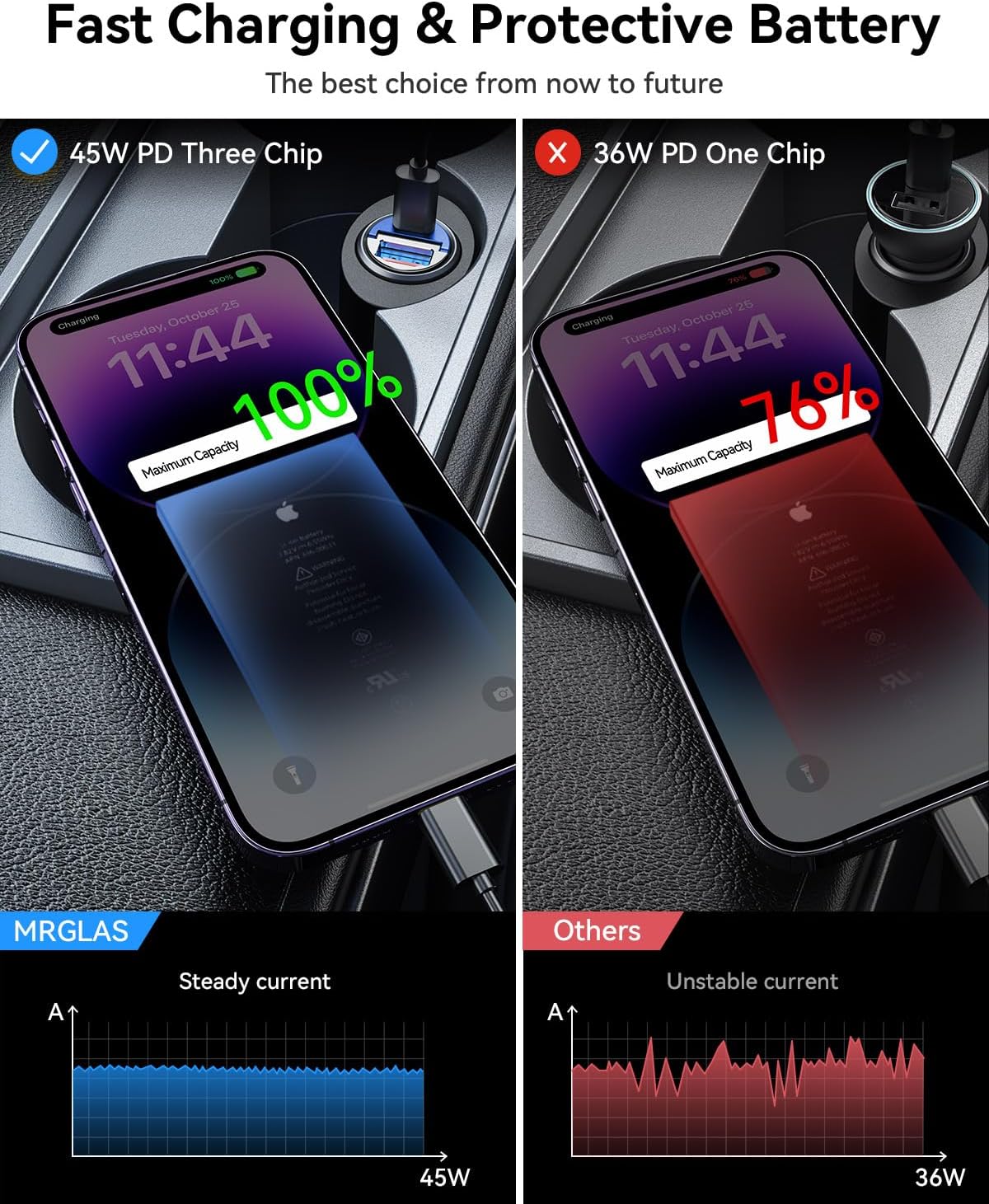 - OFFICIALLY APPROVED CHIP, AIM FOR FASTER & SAFER: MRGLAS fast car charger adapter Built-in PD45W&QC45W dual-core intelligent identification chip outputs 45W of fast charging current in each of its two cores, And the latest security control chip, which is a safe and high-speed Fast Car Charger without damaging the device