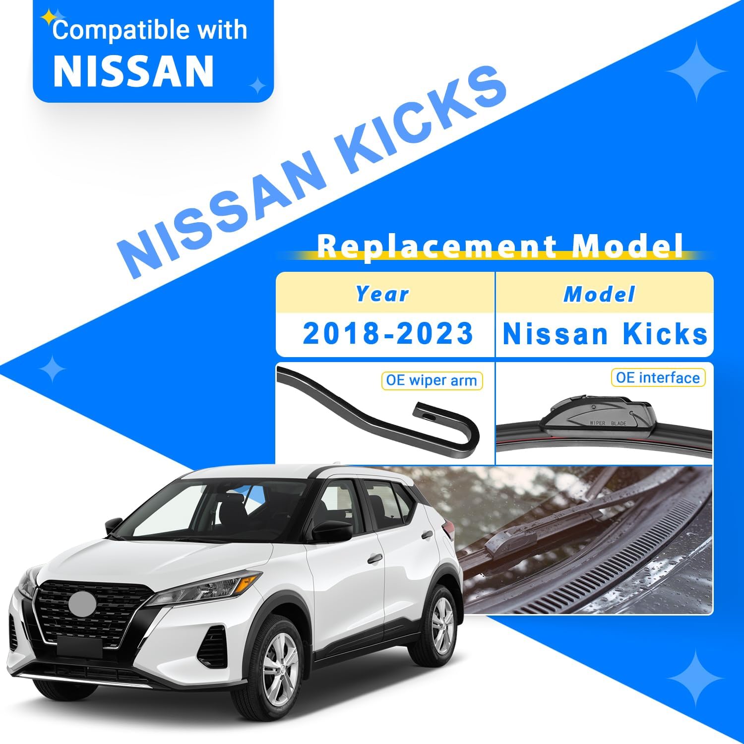 - {FITMENT}: Replacement for 2018 2019 2020 2021 2022 2023 Nissan Kicks 26inch + 16inch front with 12inch rear windshield wiper blades.