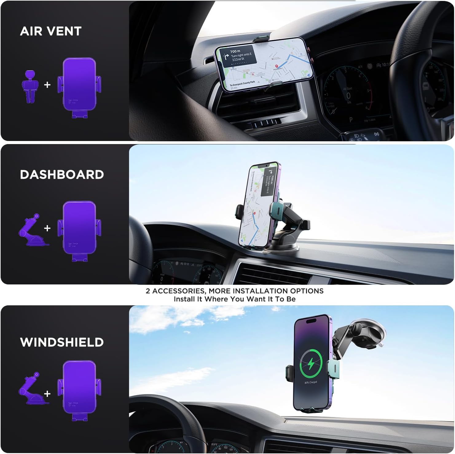 - 【SMART AUTO CLAMPING FUNCTION with METAL DESIGN】 All you have to do is gently place your phone into the car phone holder, then it automatically closes snugly around the device and adjust to the most suitable position for charging! Releasing the phone is as easy as touching a button. Made of aluminium alloy, the frame of the phone mount for car wireless charger is more sturdy and elegant