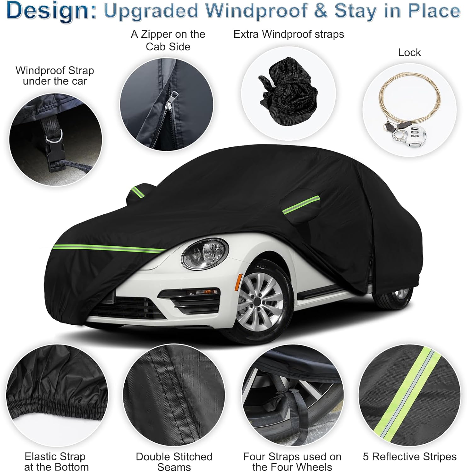 - 【Fitment】Customized Design for 1998-2022 Volkswagen New Beetle. Size: 168(L)* 71(W)* 58.5(H)in. Please make sure your car model and the length before purchase.This car cover with Zipper will fit your Beetle bug perfectly. If there are any quality issues with the product you receive, please contact us immediately and we will send you a new car cover for free
