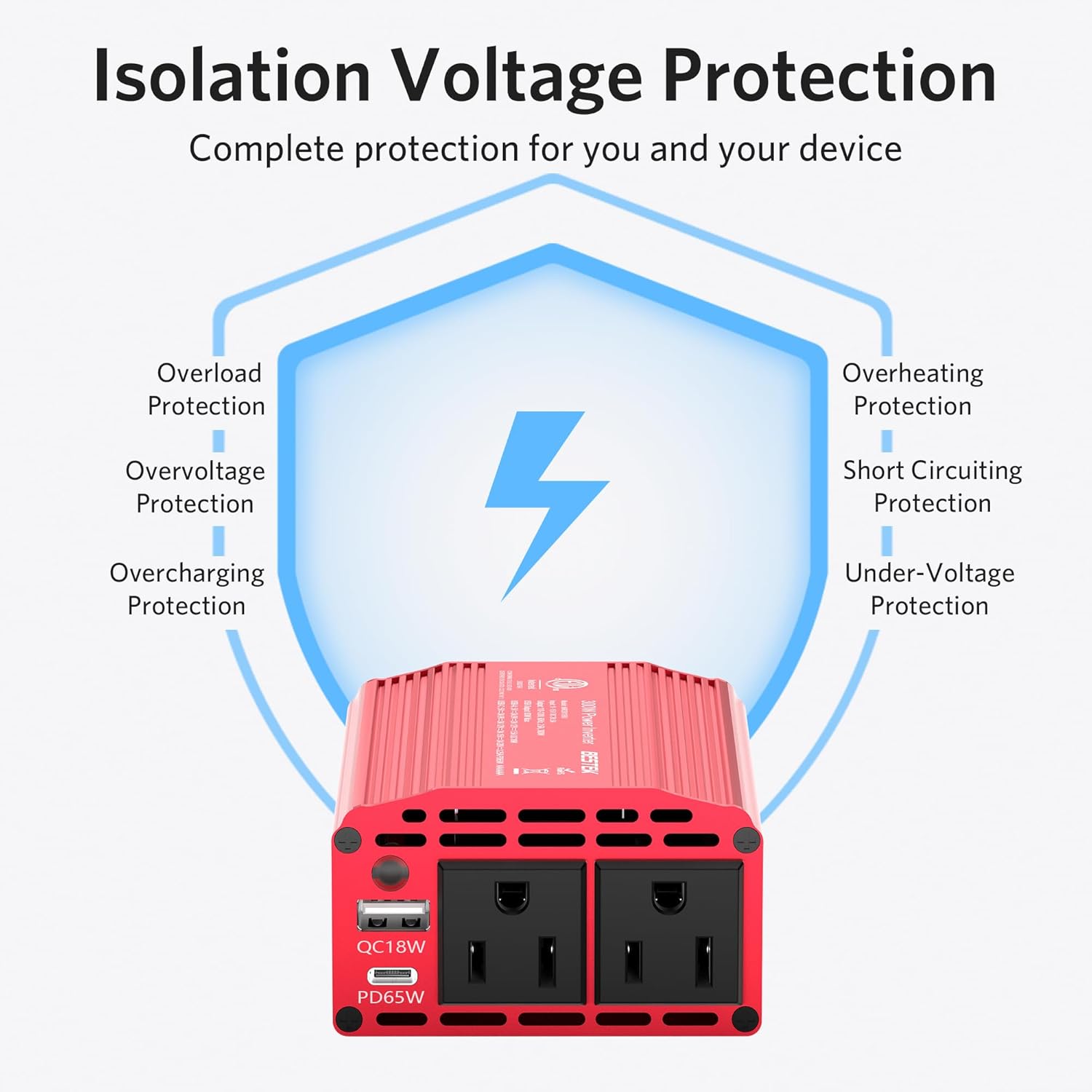 - Powerful and Versatile: This 300W power inverter has 2 AC outlets with 65W USB-C and QC18W USB-A charging ports and can power up to 4 devices simultaneously. You can quickly charge your cell phone, laptop, camera, tablet and other digital devices on the go, as well as power other devices such as air pumps, breast pumps, CPAP machines, nebulizers, car vacuum cleaners and more