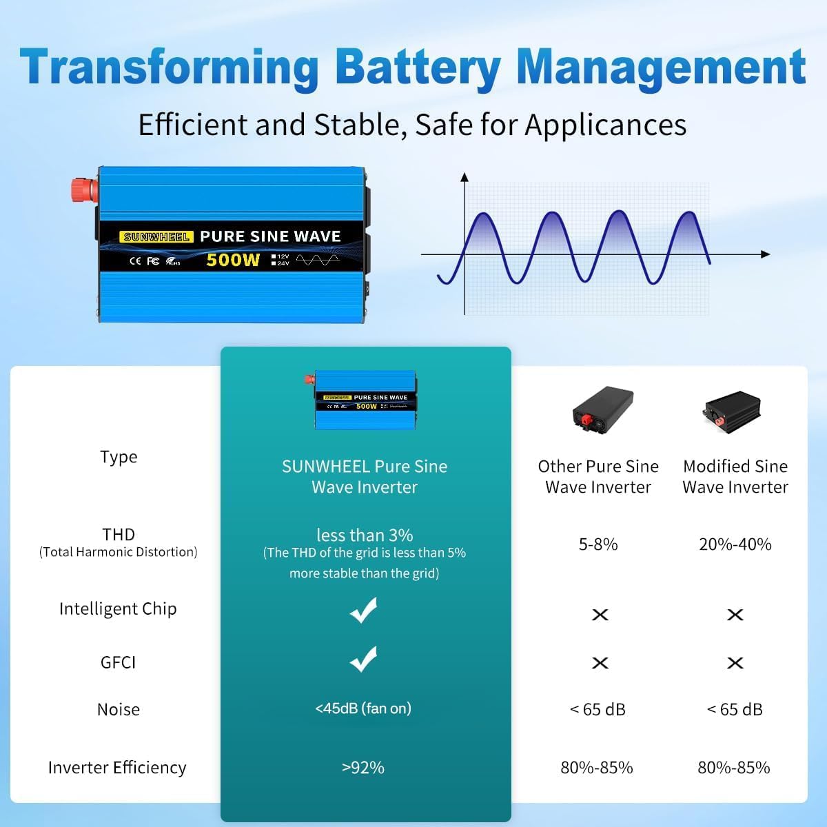 - 【500W 24V pure sine wave inverter/1000W peak power】Utilizing advanced pure sine wave technology, it can efficiently convert stable and high quality current for your electronic products and household appliances. Running your equipment with pure sine wave technology is less than 60dB compared to modified sine wave technology, ensuring you a comfortable and quiet environment while ensuring your electronics run smoothly when turned on.