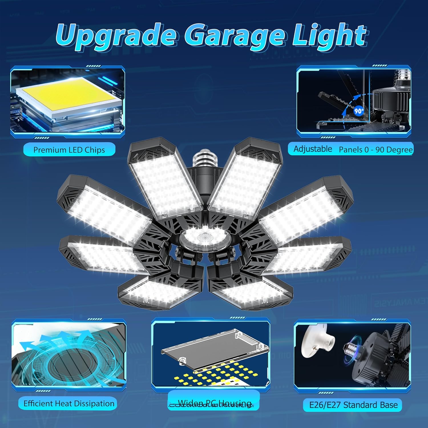 - Custom Your Lighting: Updated 8+1 deformable panels of the garage ceiling light can be adjusted to 0 - 90 degrees easily to customize the lighting angle, offers the flexibility of lighting needs to light up your workspace, achieving 360 degrees lighting. The PC housing area is widened on both sides to provide a wider lighting area. Say goodbye to dim and shadowy corners that hinder your work.