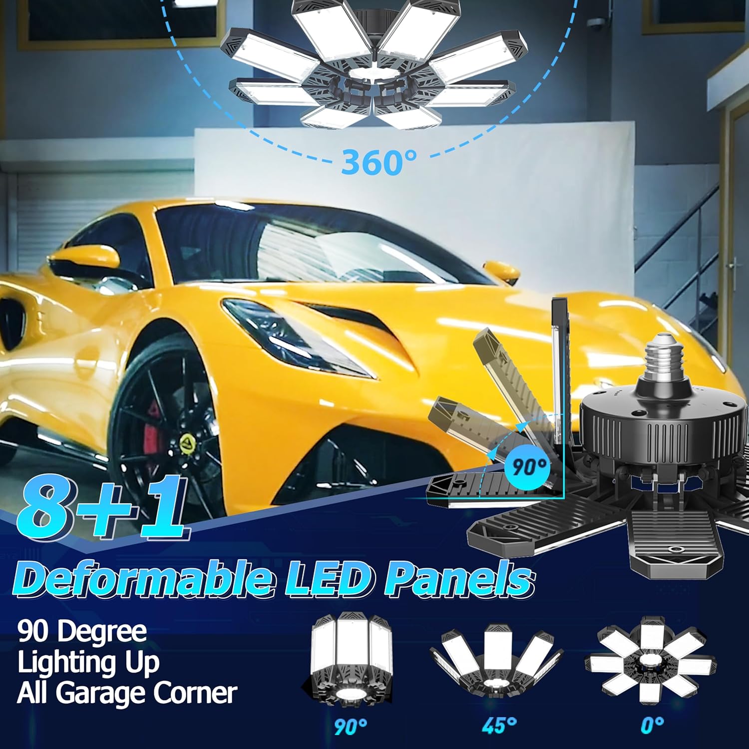 - Custom Your Lighting: Updated 8+1 deformable panels of the garage ceiling light can be adjusted to 0 - 90 degrees easily to customize the lighting angle, offer the flexibility of lighting needs to light up your workspace, achieving 360 degrees lighting. The PC housing area is widened on both sides to provide a wider lighting area. Say goodbye to dim and shadowy corners that hinder your work.