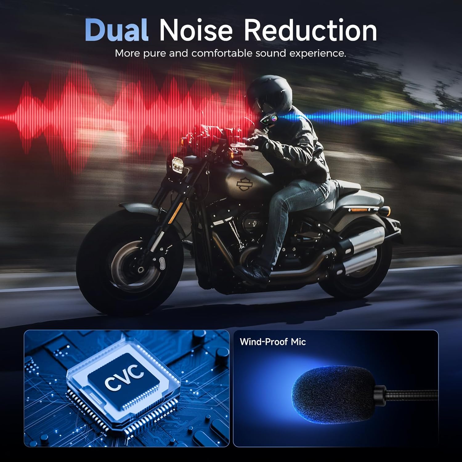 - 【Hi-Fi Stereo & Dual Noise Reduction】Moman H1 motorcycle intercom combines Hi-Fi stereo sound with advanced noise cancellation technology. Its 40mm high-fidelity driver delivers rich audio and clear call quality, ensuring an immersive experience. Featuring dual noise cancellation with a CVC chip and a windproof microphone, it effectively reduces background noise for crystal-clear communication.