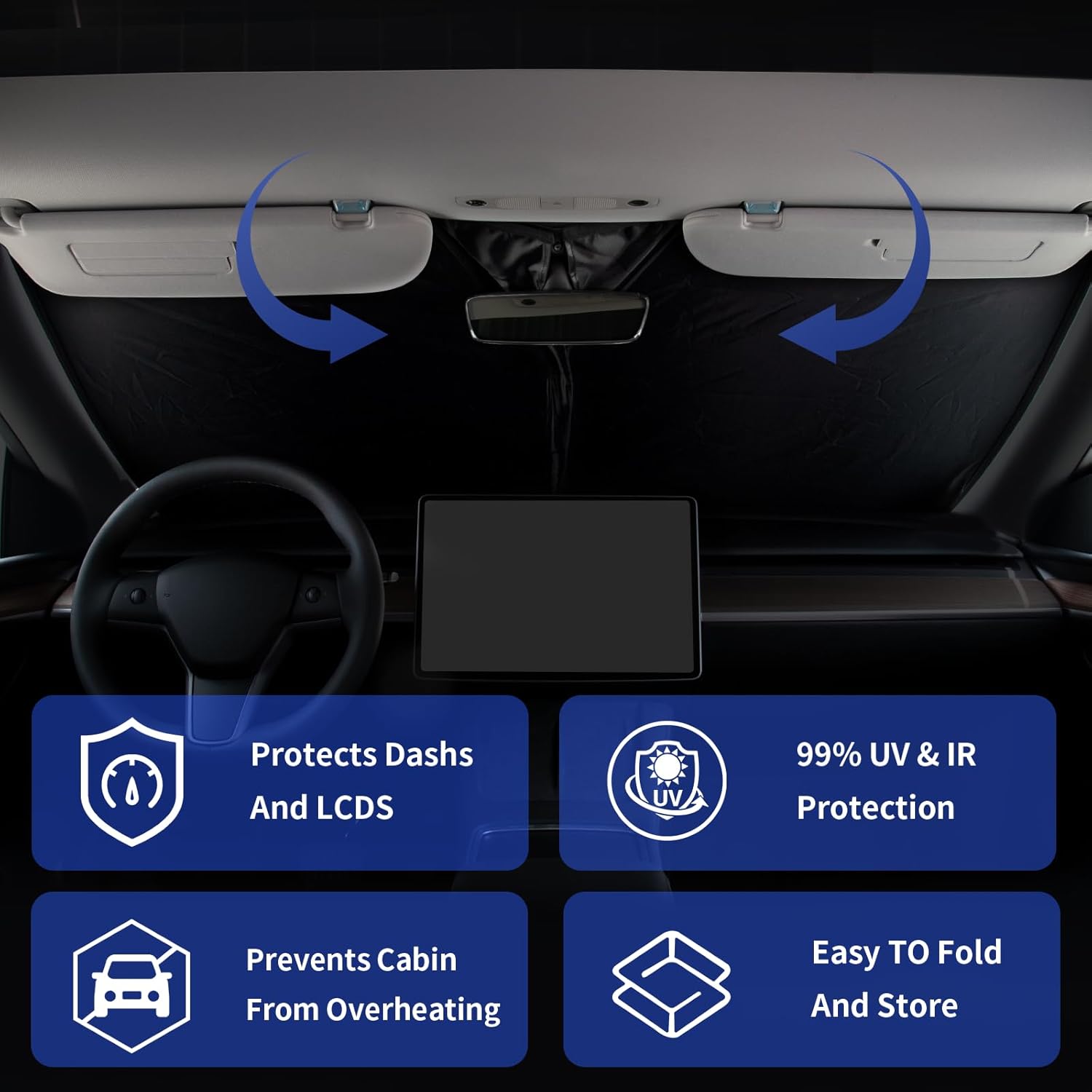 - ăUV Relfective and Easy InstallăOur Sunshades in first try and Installing the Sun Shade takes only 10 seconds. The windshield sunshade provides excellent sun protection for the inside of vehicles. Your car's interior temperature will remain at an ideal level thanks to the premium, long-lasting 240T Sun Shield Reflective Polyester sun blocker screen protector material!