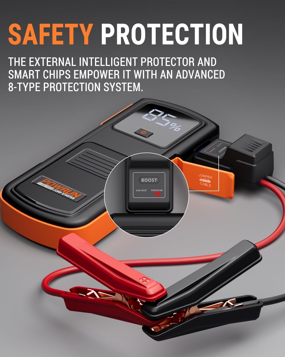 - POWERFUL JUMPING PERFORMANCE: The Powrun P-ONE MAX Jump Starter boasts a peak current of 4000 Amps, allowing it to quickly start your vehicles for all gasoline engines and diesel engines up to 10.0L. With a single charge, it can jump-start vehicles up to 40 times. Even when battery voltage is extremely low (below 9V) hitting the “BOOST” button will force the vehicle to restart.