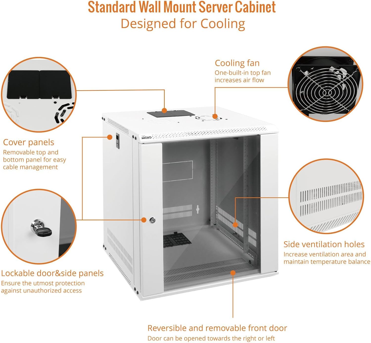 Tecmojo 12U Wall Mount Rack Network Cabinet for 19" IT Equipment,with Lockable Glass Door and Side Panels,Cooling Fan,17.7inch Depth,White
