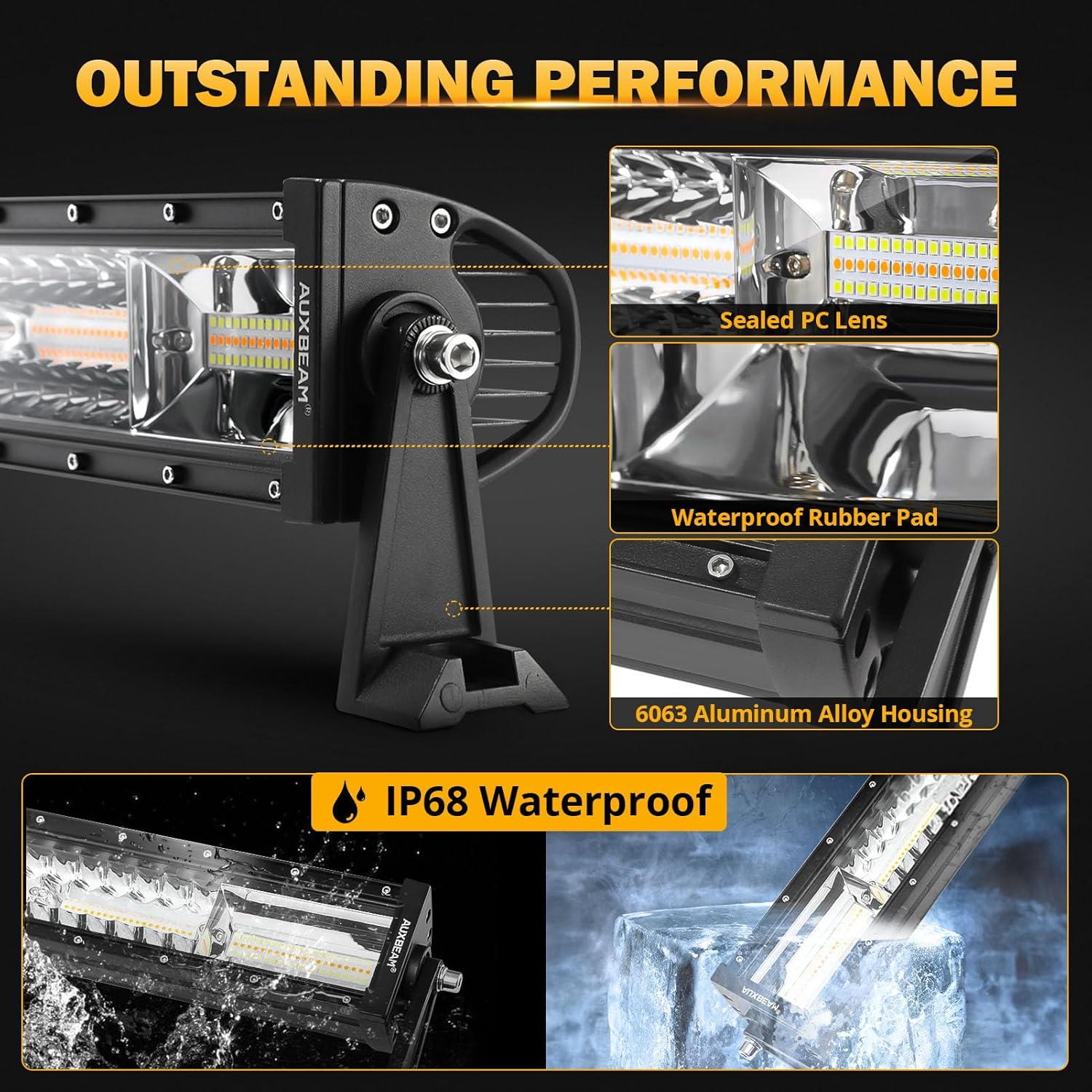 - White and Amber Combo Beam: Auxbeam dual color light bar features a unique blend of yellow and white light, designed to provide optimal visibility and a stylish look. The warm yellow light is gentle on the eyes and ideal for foggy conditions or night driving, reducing glare and strain on your eyes. The bright white light ensures clear, broad visibility, illuminating the road ahead effectively.