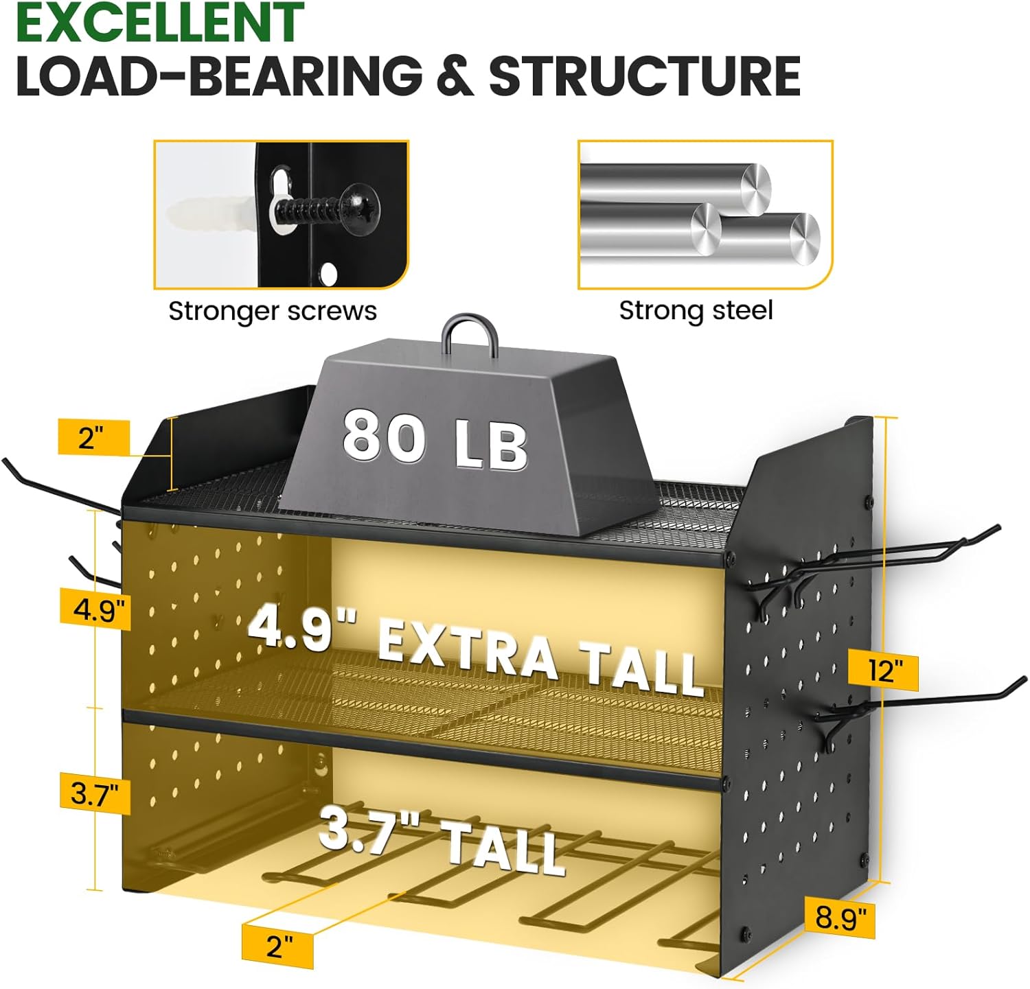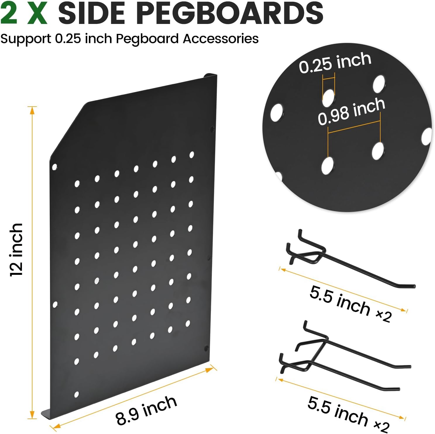 - Versatile Side Pegboards: Size 12"H×8.9"D, hang garage tools on pegboards with 4 included hooks, supports 0.25" pegboard accessories for DIY customization to increase storage space, improves load capacity and stability of the power tool rack