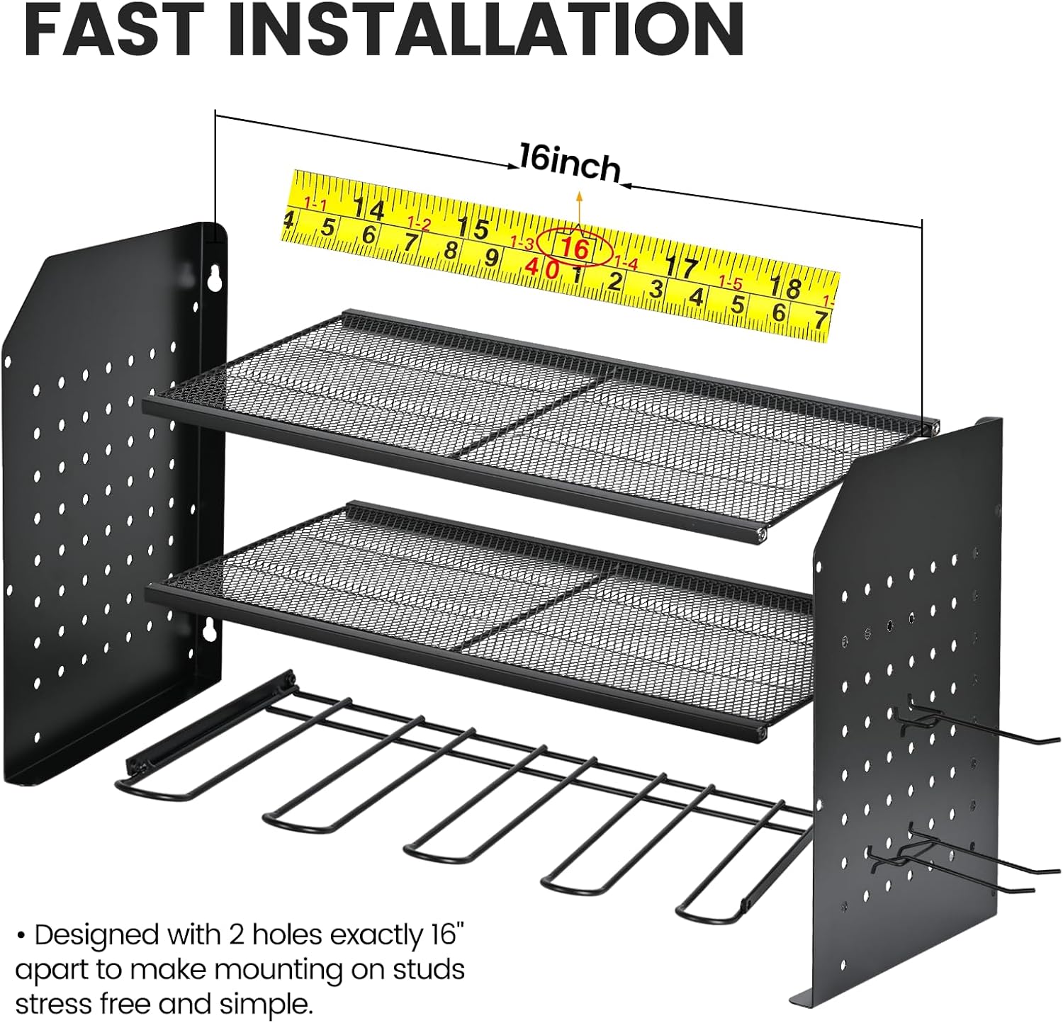 - 3-Layer Efficient Storage: Top layer 16"L×8.9"D for high cans, batteries; middle layer 16"L×8.9"D×4.9"H for toolboxes, power tools; bottom layer for 4 cordless drills; side pegboards with 4 hooks support 0.25" accessories for DIY storage