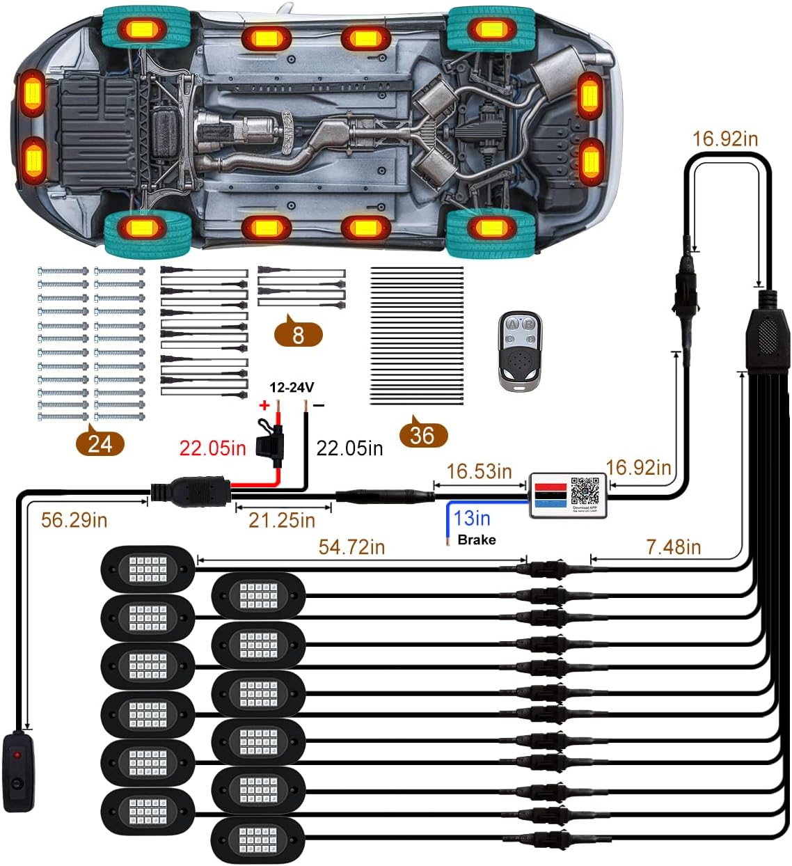 - [ RGB Multi-colors & Music Mode ] β€ After install the APP, you can choose any color as your need, and each pod have a 150Β° super wide-angle lights. The underglow lights kits will dance to the rhythm of your music, including relaxing tunes, slow and dance music, enjoy every moment of your favourite music when you are driving.