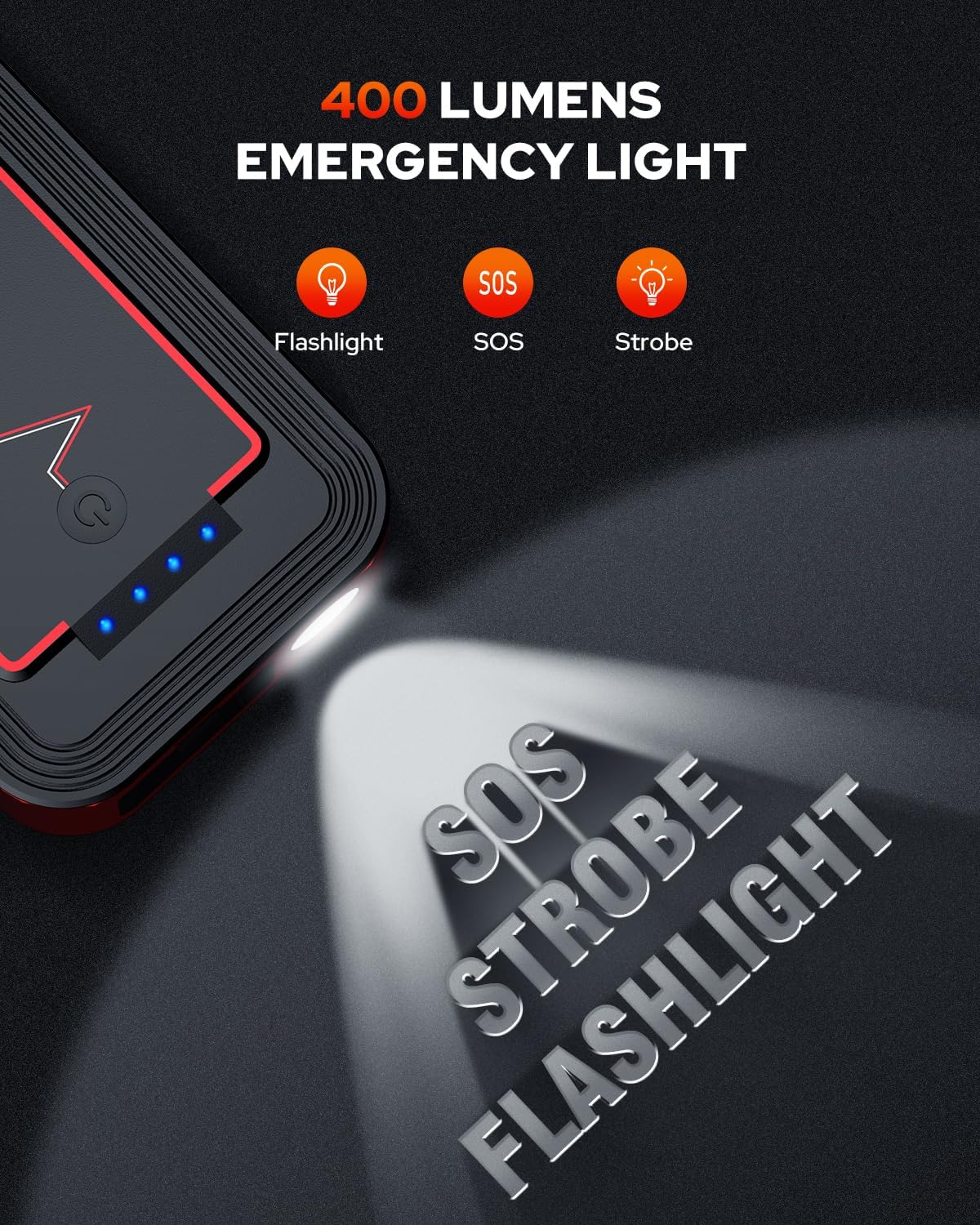 - â ALL IN ONE jump starter - This jump start battery pack integrates 4 practical functions to meet all your needs, including car emergency starting, 400-lumen LED lighting(stable, strobe, and SOS), Power bank 20000mAh with QC3.0 fast charging, and 12-16V/6A DC port to power your 12V vehicle-mounted devices. while it's only weights 1.2pounds, Say goodbye to old bulky jump start battery pack NOW!