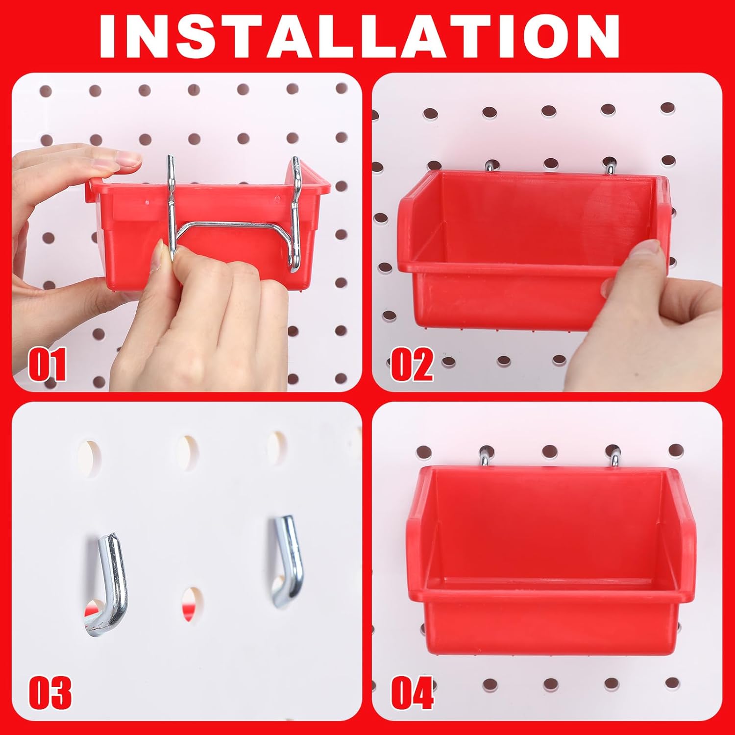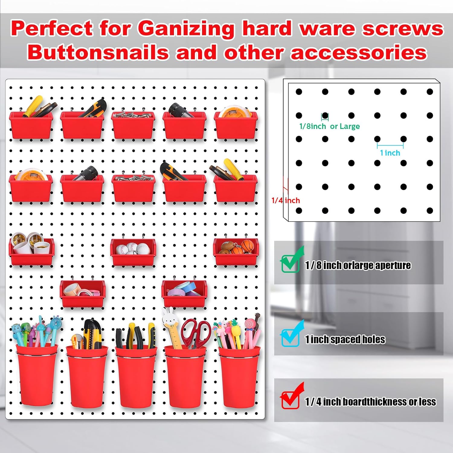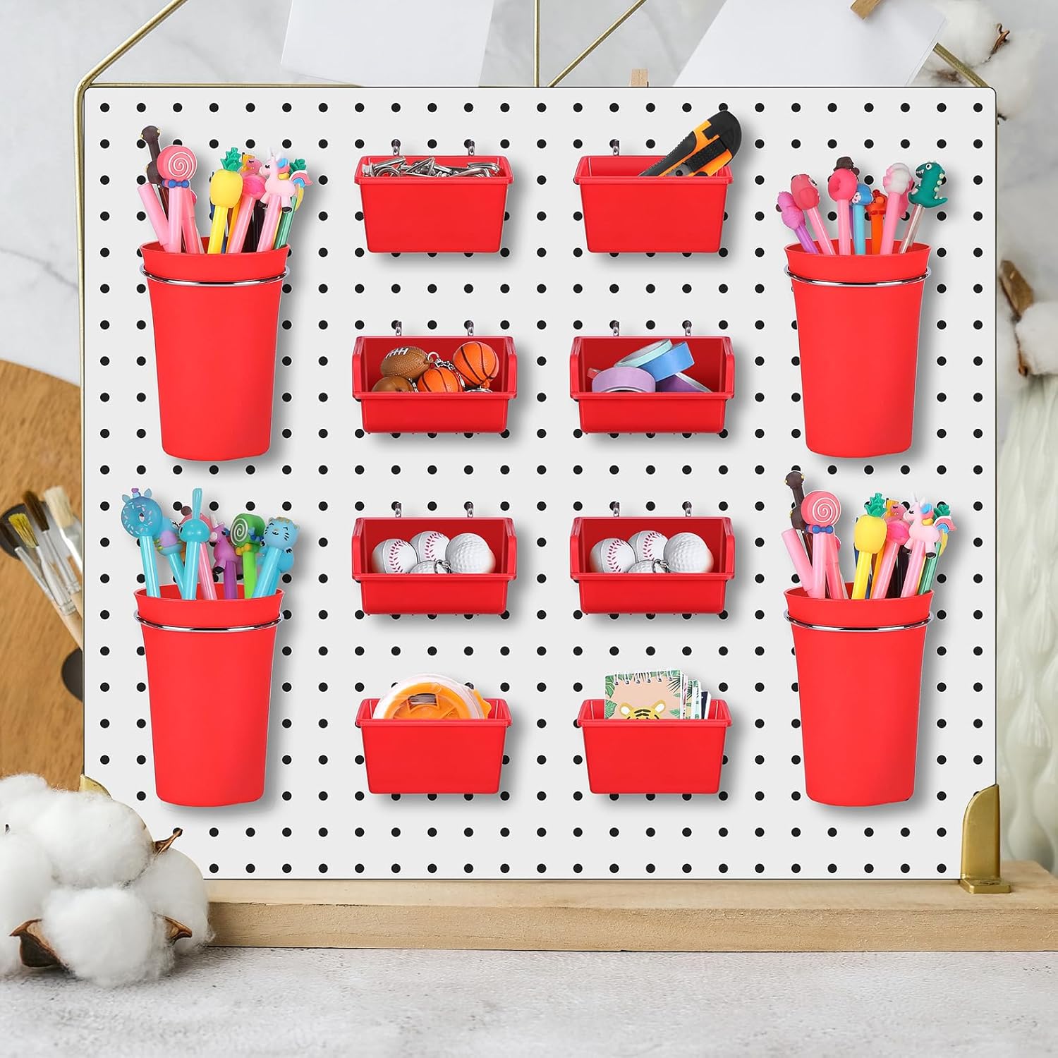 - Diverse Heavy Duty Size: you will receive 5 pieces of pegboard cups in 3.35 - 2.36(D) x 4.72(H) inches,15 pieces of peg board bins in different sizes, namely 3.54 x 3.15 x 1.77 inches (L x W x H), 3.94 x 3.94 x 1.97 inches (L x W x H), coupled with metal cup hooks in 3.35 inches and 2 inches loop pegboard, the diverse size and enough quantity to meet your various needs; Note: the pegboard is not included