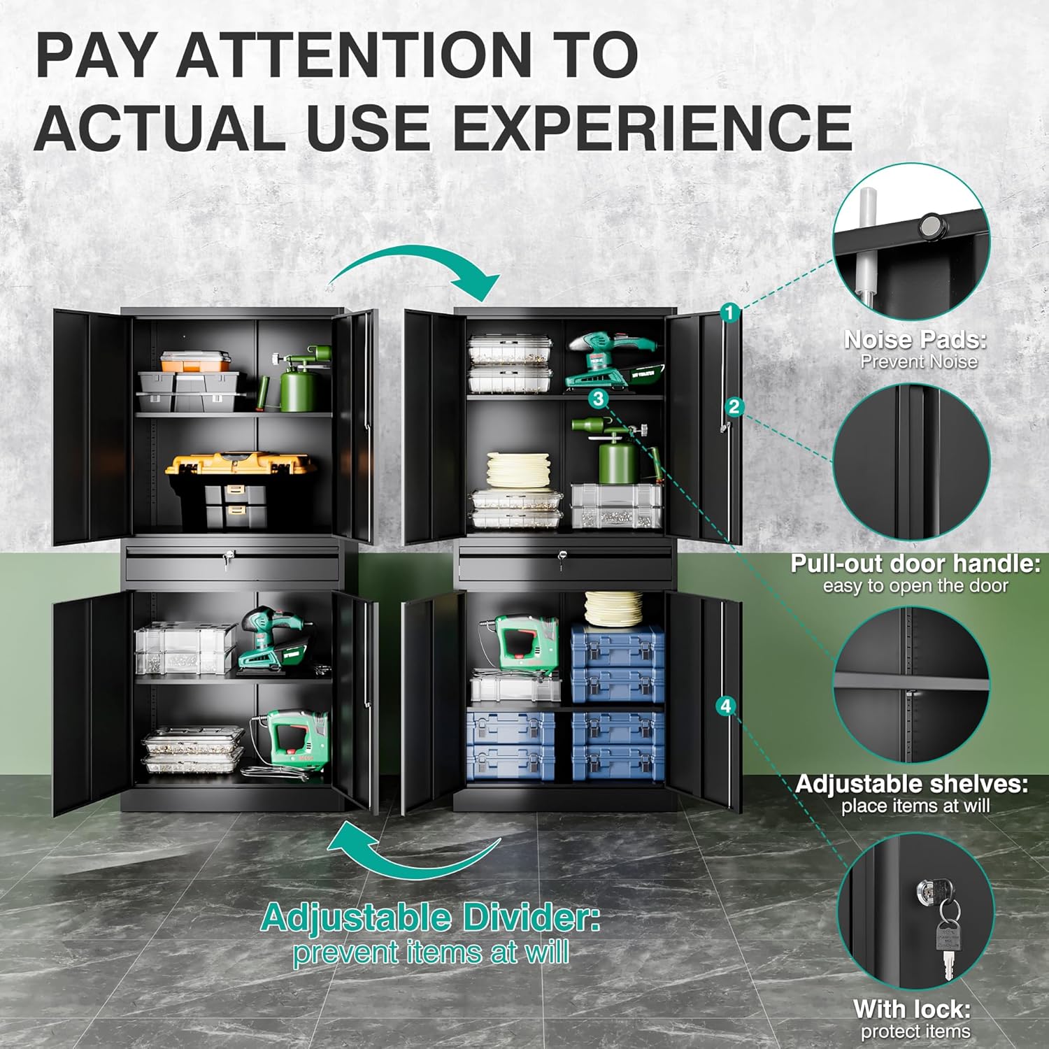 - ✔️☆【Adjustable Shelf Design】: The garage cabinets storage uses 2 adjustable shelves. You can move to the desired height by adjusting the shelf pegs according to the size of the things. so that you can divide the office storage cabinet space distribution. You can also design garage storage flexibly and remove the shelves for more standing room