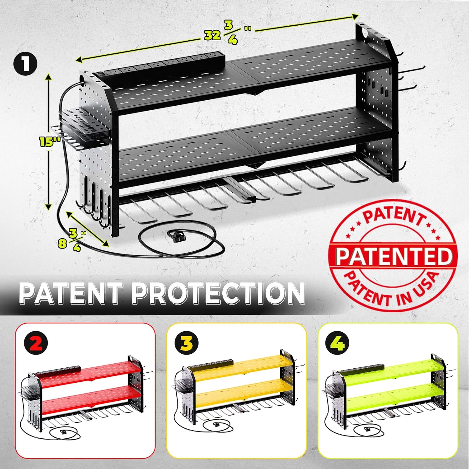 - Efficient Storage: The KAFAHOM Electric Tool Rack is designed with three tiers and eight dedicated slots to efficiently store your electric tools. The top tier features a built-in charging station, enabling direct charging while tools are stored.The power cord is 7 FT long 14AWG,and the charging station is 15A 125VAC 1875W 60Hz.
