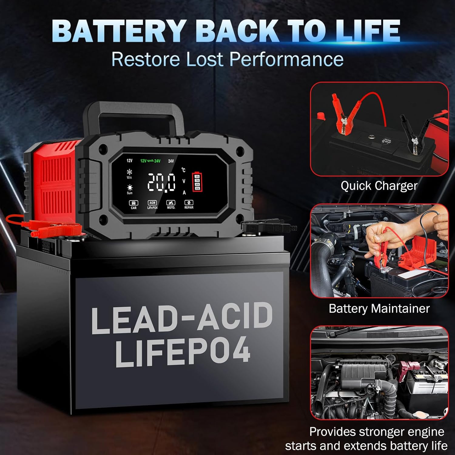 - ✅【3-in-1 Quick Battery Charger, Maintainer and Desulfurizer】Works as 12V or 24V battery charger, this 12V/20A and 24V/10A fully-automatic smart charger is powerful to solve various battery problems. It's the all-in-one solution battery charger, battery maintenance charger, trickle charger, plus battery desulfator. Automatically battery test, charge and maintain your loss battery for stronger engine starts and extend battery life.