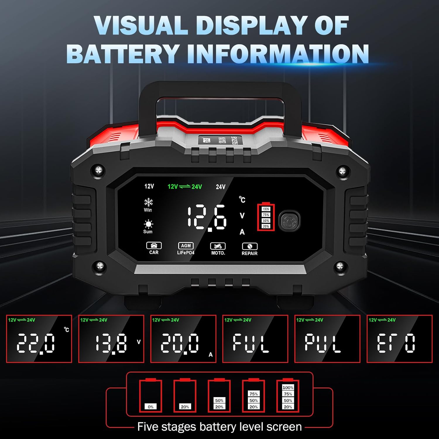 - ✅【Large LCD Display Visualized Charging】The on board battery charger owns a larger screen that clearly shows charging voltage and current, power percentage, battery full,temperature, battery full, summer mode, winter mode, etc. With two support feet design, easily monitor your battery's health. This 12V/24V automotive charger automatically detect battery voltage, battery sulfation and acid stratification, adjust the charging current, easy to deal with a variety of harsh voltage environments.