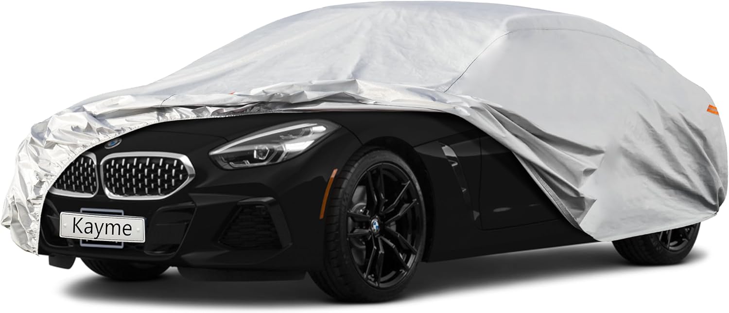 - ăPremium Materială-Kayme 6 layers car cover is made of heavy duty material. 1 PE&PEVA is 100% waterproof, It's great for rainproof snowproofing. 2 High reflective aluminum is good at sunproof and anti-uv, Keep the car cool in the summer. 3 Thicker and soft cotton will protect vehicle painting. Kayme multi-layer material is much thicker and more durable than other similar products.