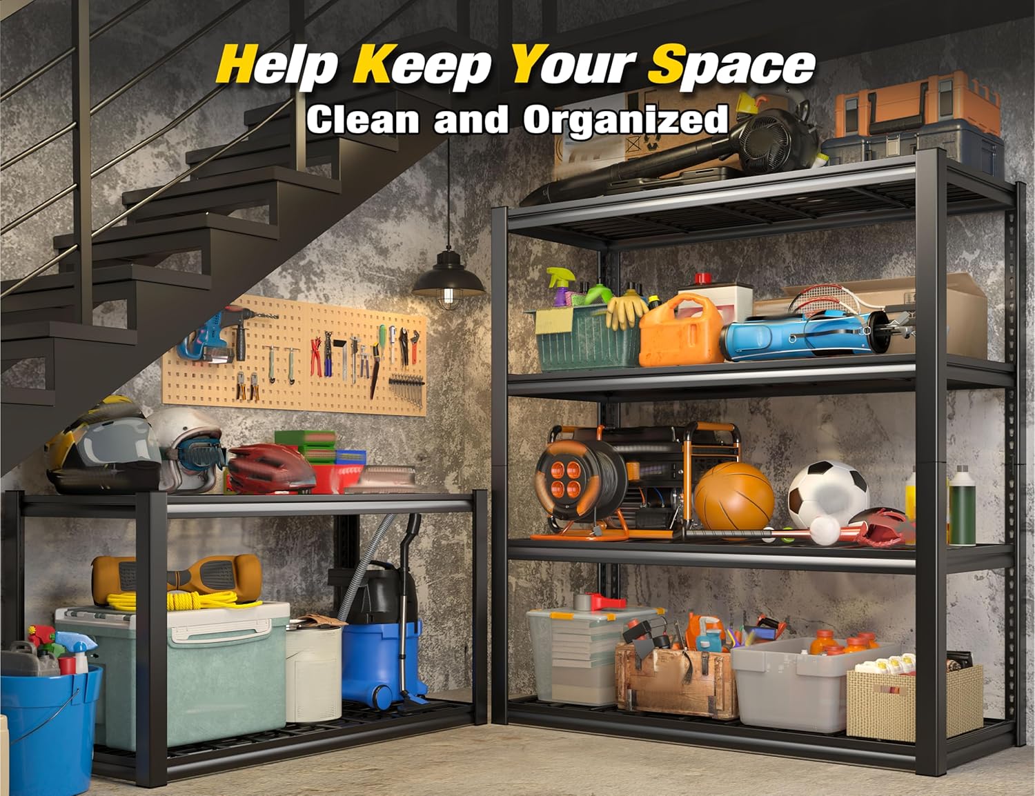 - 【2200 LBS Garage Shelving Heavy Duty】This garage shelving is born for placing heavy objects, its load-bearing capacity can reach an amazing 2200LBS, each layer bearing 550LBS, even if you are stacked with fitness equipment on the top, this garage storage shelves will not be deformed and bent. The stable and strong garage shelves makes it completely suitable for warehouse, supermarket, industrial and other scenes, and can carry all kinds of heavy goods
