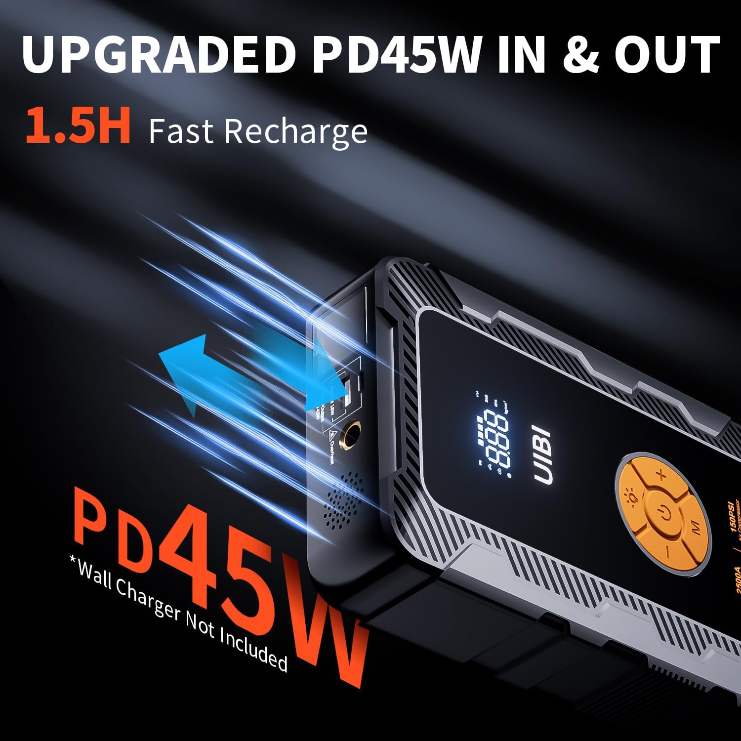 - 【3X Faster Than Ever】 UIBI portable car jump starter with air compressor has upgraded fast charging function in 2023. Not only the USB-A output port ( QC3.0 5V/3A 9V/2A 12V/1.5A) but the Type-C two-way port (PD45W 5V/3A 9V/3A 12V/3A 15V/3A 20V/2.25A) supports fast charging. You can quickly charge your various USB devices through any port. Also quickly charge the battery jumper box through the Type-C PD45W that can be fully charged in about 1.5 hours at the fastest, 3 times faster than others