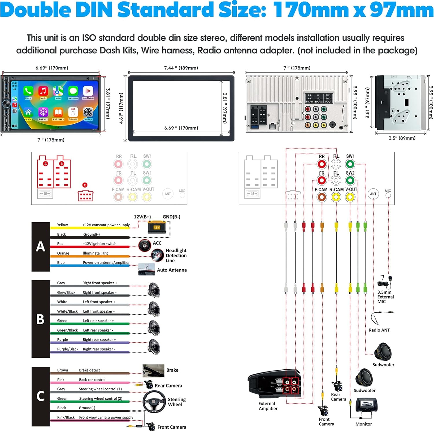 Upgrade Wireless Double Din Car Stereo with Carplay, Android Auto, Bluetooth, 4-Channel RCA, High Power, 2 Subwoofer Ports, 7" HD Capacitive Touchscreen Car Radio, Backup Camera, Audio Receiver