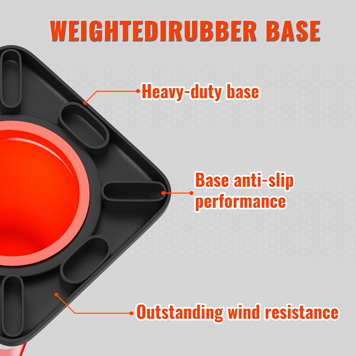 - STABLE AND DURABLLE: Our heavy duty traffic cone 14x14inch black base design and 5.5 pound weight add wind resistance, allowing the safety cone to firmly grip the road and is not prone to tipping over and being blown down by the wind. Withstands high temperatures, sun exposure, cold freezes, and severe collisions.