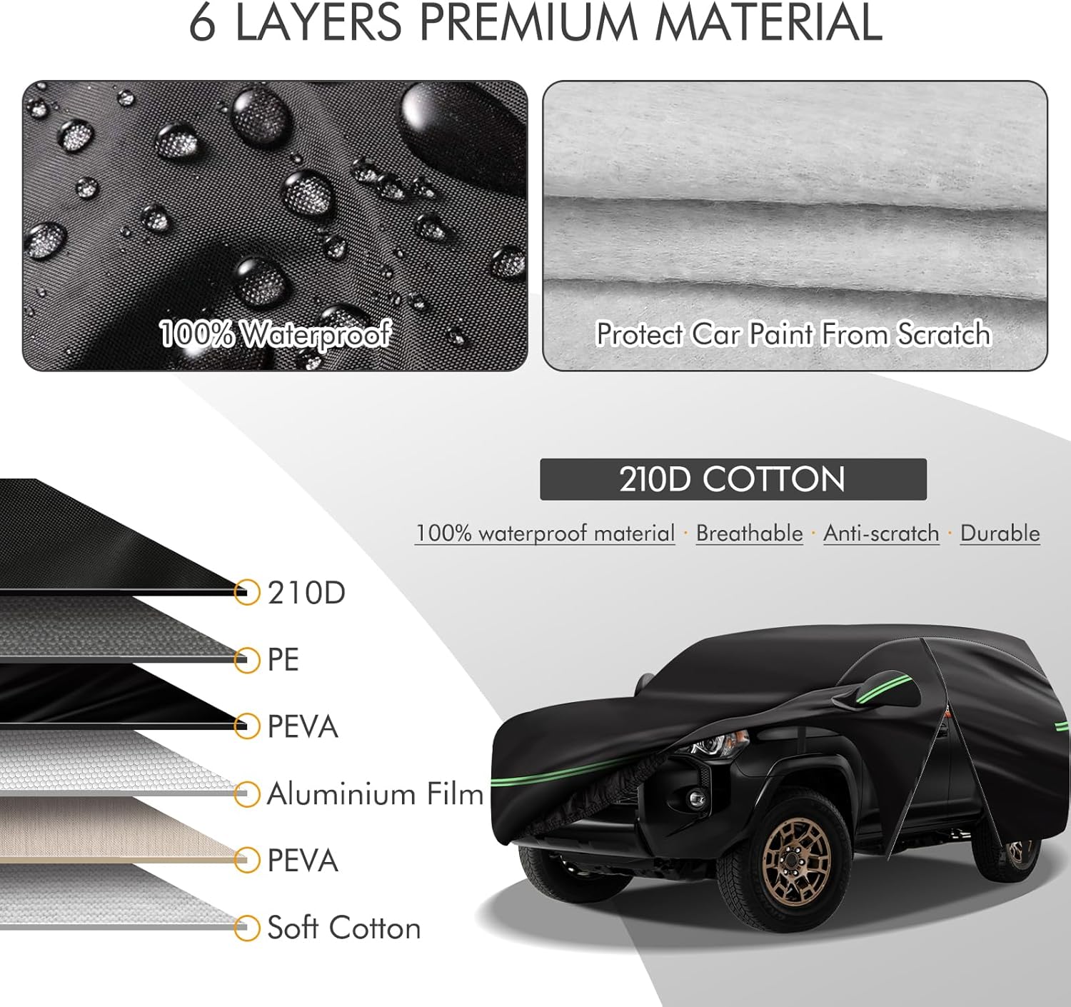 - ðãPremium MaterialãThe car cover for Toyota 4runner is made of heavy-duty 210D Oxford cloth and waterproof silver-plated fabric, and has multi-layer cotton coating, which can be windproof, dustproof, UV-proof, sun-proof, not easy to tear, and withstand water pressure up to 1600mm. The inner layer also has a thickened cotton backing, which not only fully prevents the paint from being scratched, but also has thermal insulation, which is warm in winter and cool in summer.
