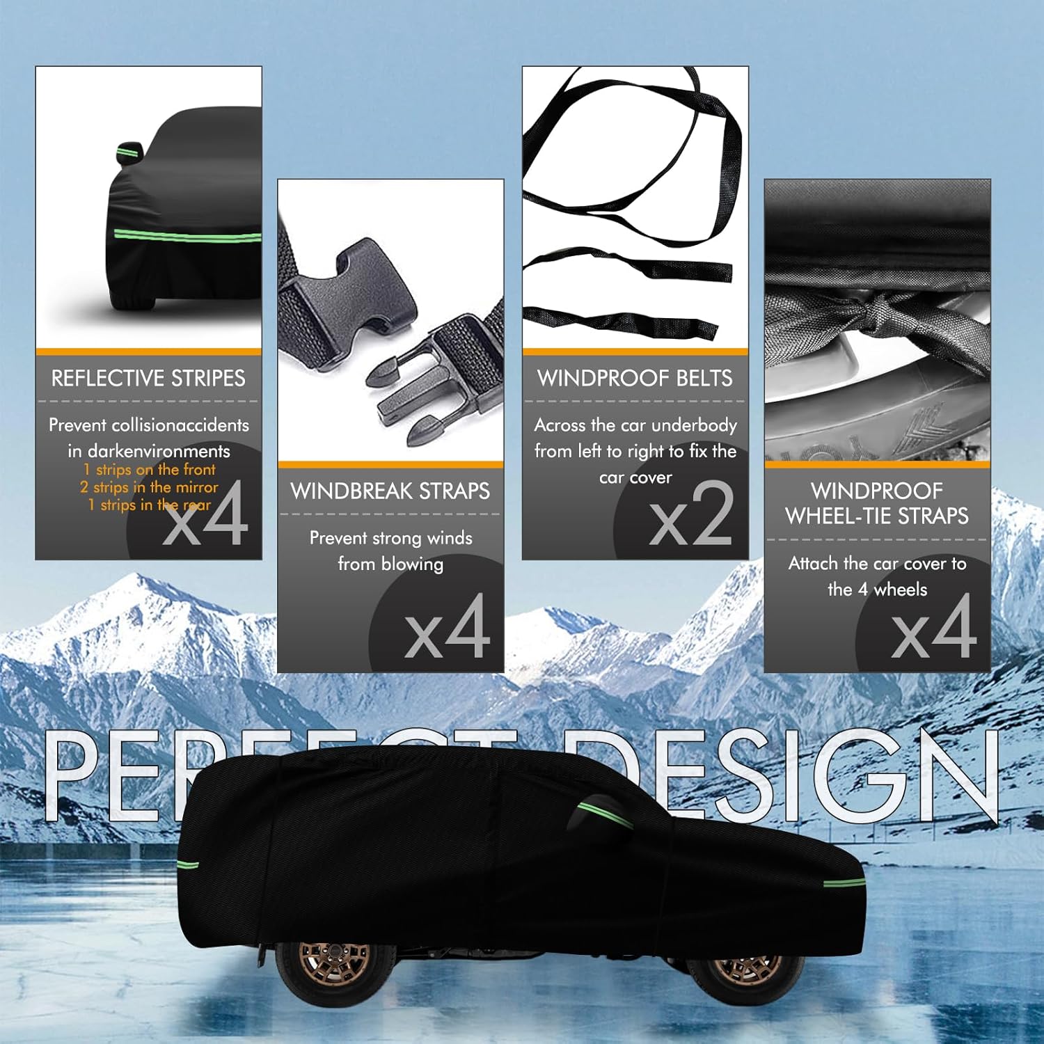 - ðãUpgrade Windproof Designãâ A windproof fixed buckle pass through the middle of the car for easy fixing; â¡Windproof belts at the front and rear; â¢4 straps to tie the cover to the four wheels; â£Elastic band at the bottom can easily adjust the size of the cover; â€Double stitching ensures that the cover will not tear easily, making it more durable; â¥The included safety latch secures the cover. Multiple upgraded designs keep your protective cover from being blown away even in strong winds.
