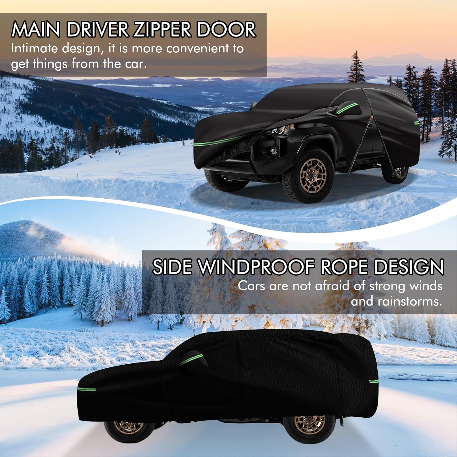 - ðãSafety and Humanizationãâ The car protection cover has 2 zippers on the front door sides to facilitate temporary access to items; â¡The 4 reflective strips are located at the front, rear and the two side mirrors of the car to prevent nighttime collisions and other accidents; â¢Custom fit shape with 2 mirror pockets for all-around protection.