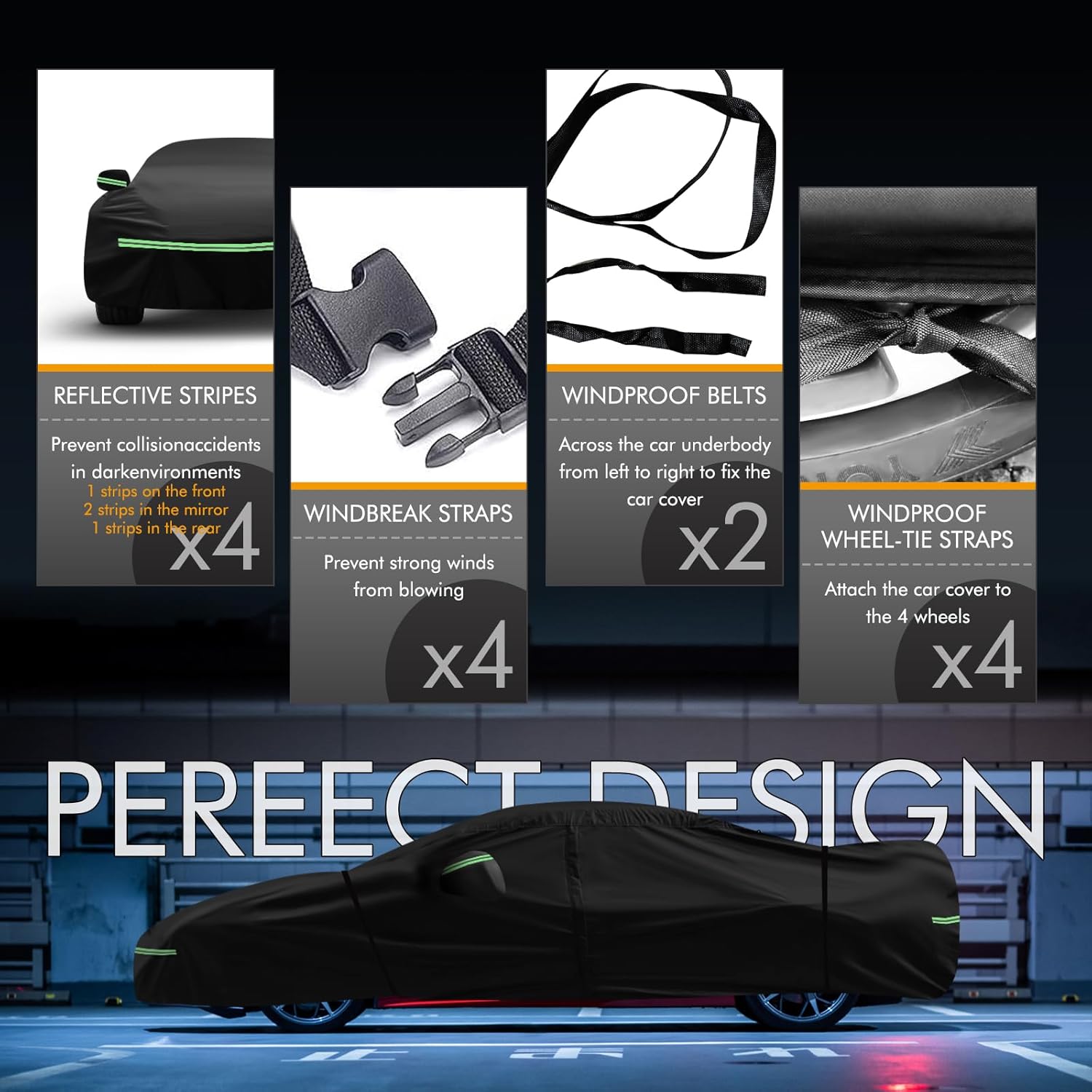 - ðãSafety and Humanizationãâ The car protection cover has a zipper on the driver's side to facilitate temporary access to items; â¡The four reflective strips are located at the front, rear and the two side mirrors of the car to prevent nighttime collisions and other accidents; â¢Custom fit shape with 2 mirror pockets for all-around protection.