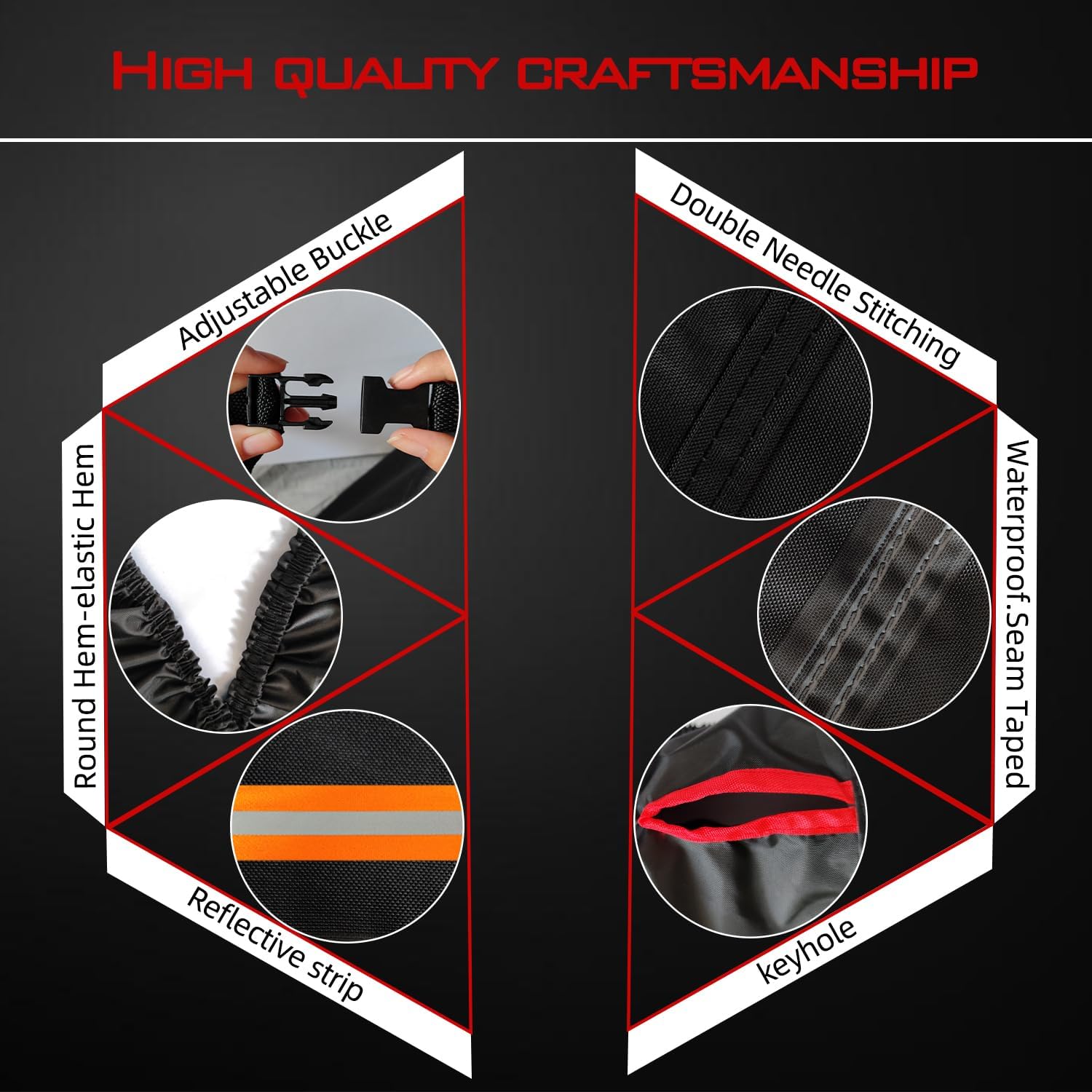 Motorcycle Cover, Heavy Duty 600D Oxford, Waterproof Outdoor, Weather Resistant, Rip-Proof, Anti-UV with 5 Reflective Strips, 2 Lock-Holes, 1 Windproof Strap, 1 Storage Bag (105" x 41" x 50")