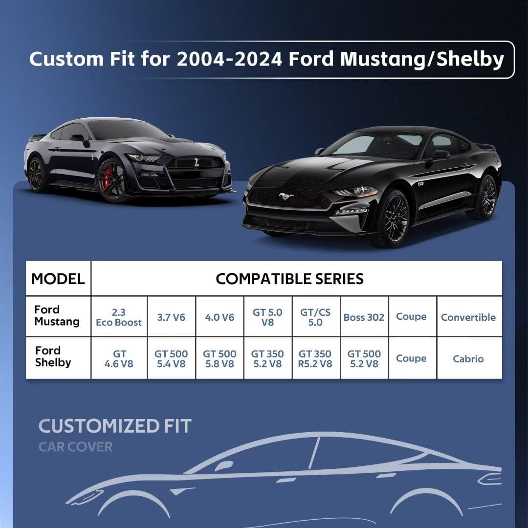 - ăPerfect Fităâ Holthly has conducted experiments to obtain a customized car cover specifically designed for Ford Mustang, Shelby, GT350, GT500 (1964-2024). The custom-like fit of the full cover not only enhances the -aesthetics of your vehicle but also provides superior wind resistance, thereby prolonging the lifespan of the hood. It offers enhanced and long-lasting protection for your car.
