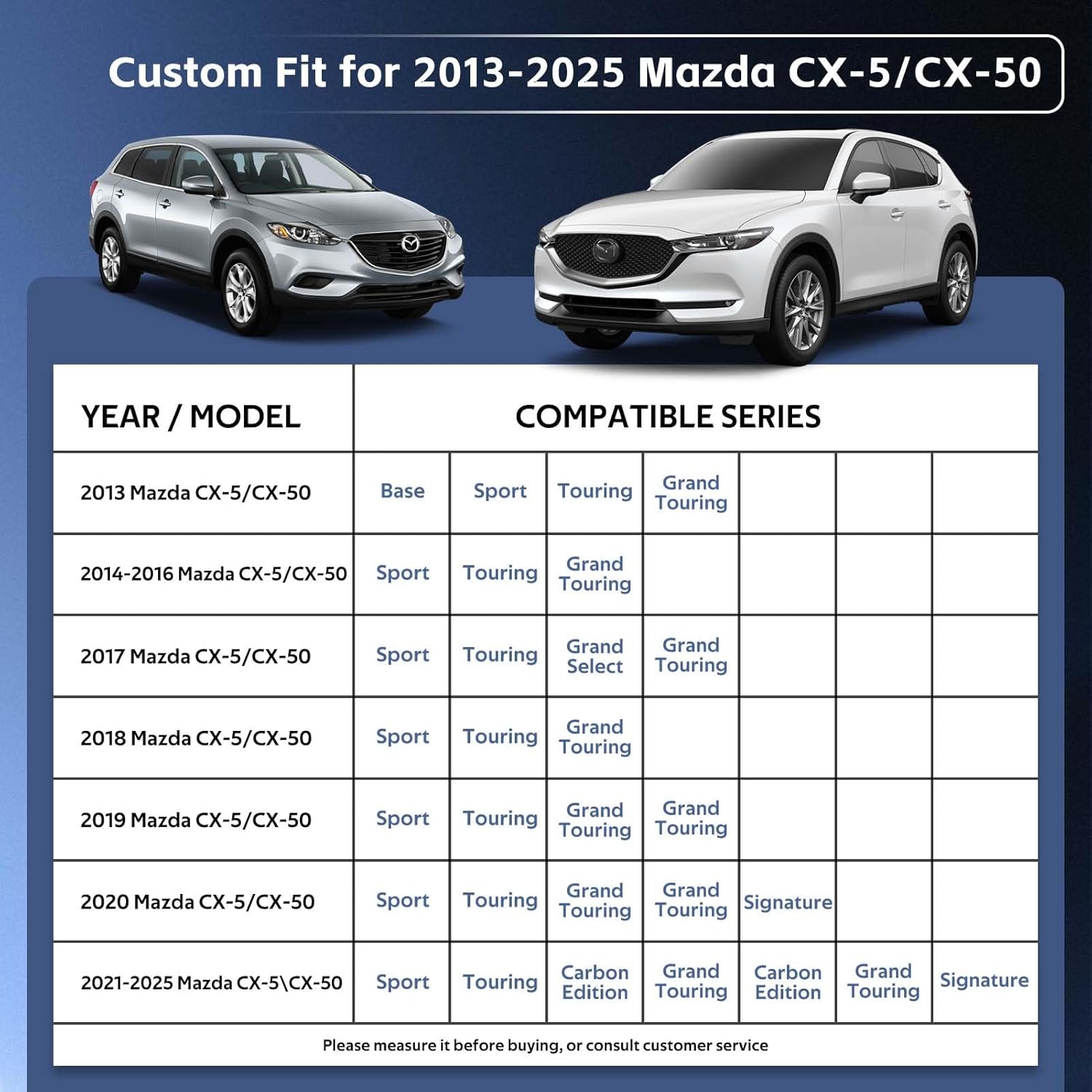 - ăPerfect Fităâ Holthly has conducted experiments to obtain a customized car cover specifically designed for Mazda CX50/CX5 (2012-2024). The custom-like fit of the full cover not only enhances the -aesthetics of your vehicle but also provides superior wind resistance, thereby prolonging the lifespan of the hood. It offers enhanced and long-lasting protection for your car.