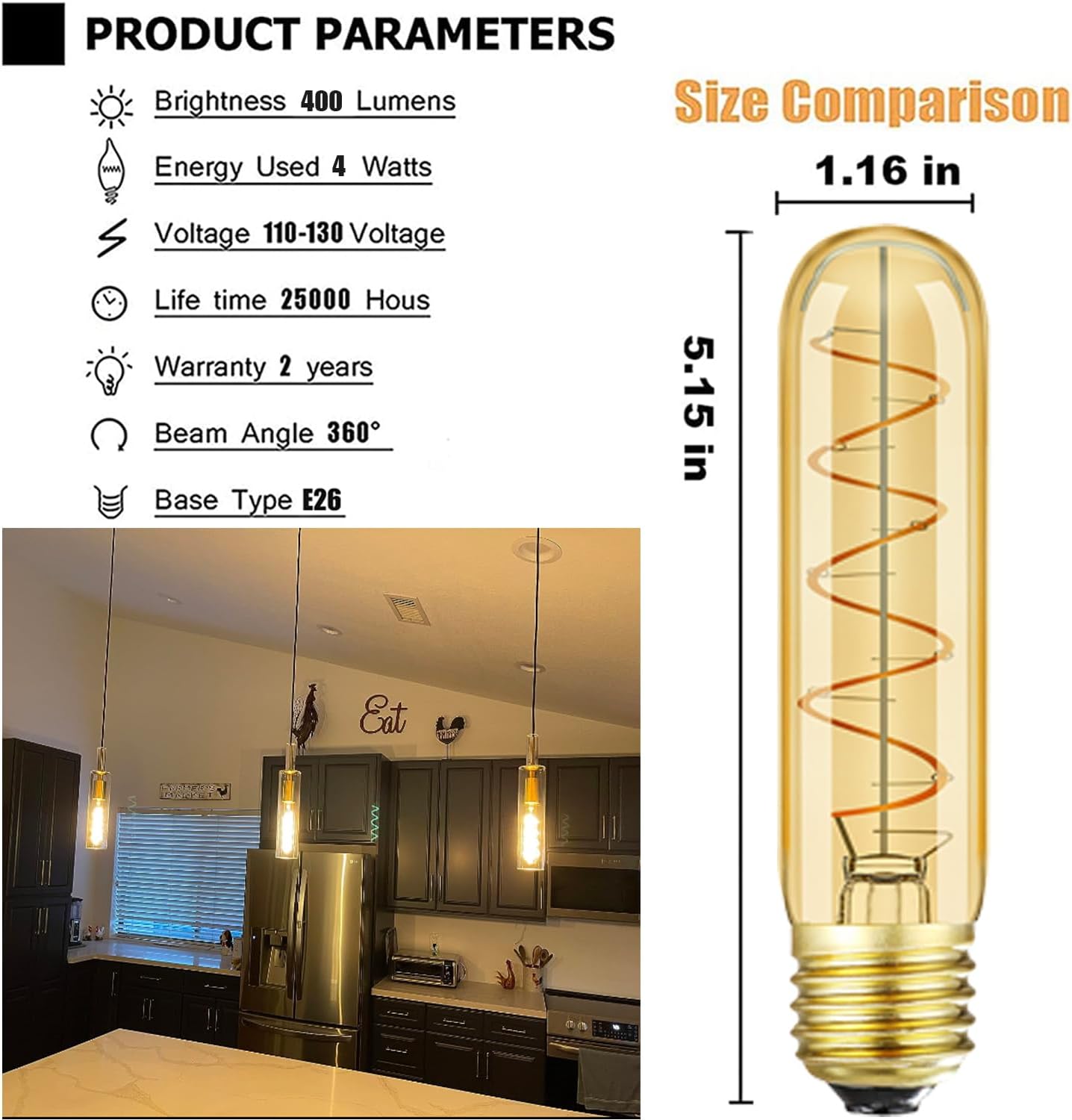 - LIFESPAN AND WARRANTY - E26 led edison bulb is up to 25000h life span and two years guarantee,No longer to get your ladder out and chang the burnt-out in darkness frequently;Email us via your order if you face any problem,replacement tube light bulbs will send or refund would be applied under warranty.