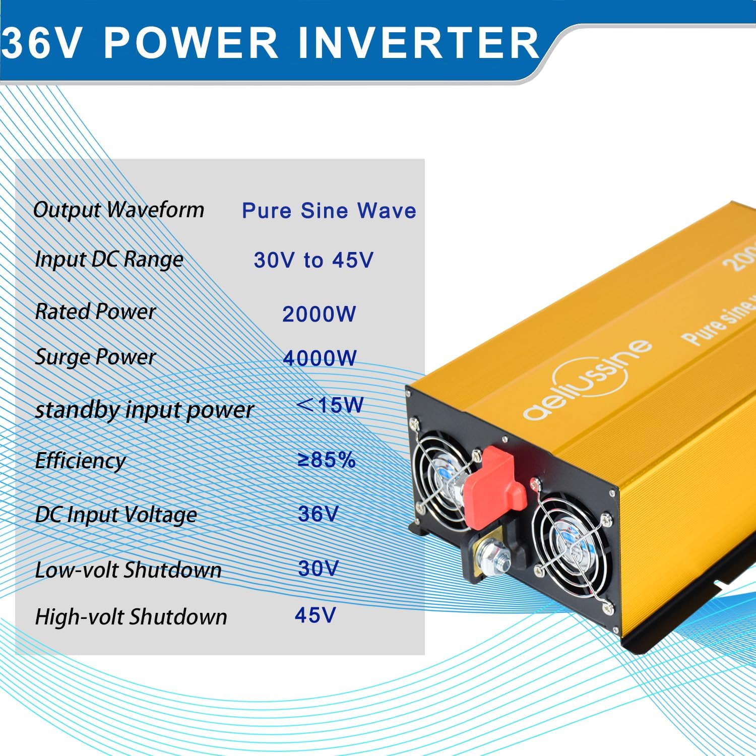 - 【pure sine wave inverter】Smooth and perfect sine waveform, just the same as home power/city power, Provide max 2000 watt continuous power and 4000 watt peak power at 60Hz frequency, power your 110v 120v ac appliance with a 36v power battery bank (battery voltage 30v to 45v is acceptable)