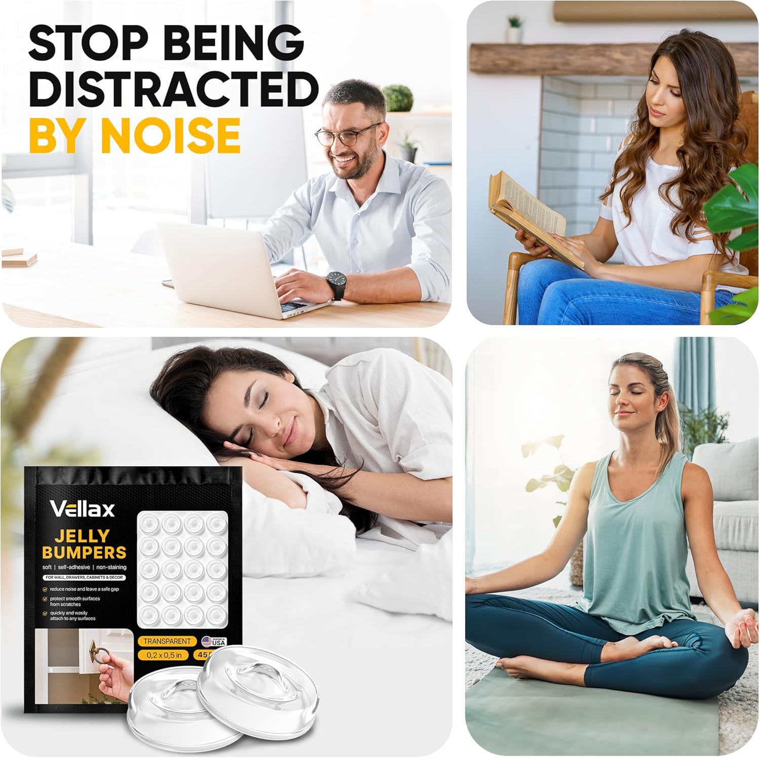 - Loud Noise Solution: Are you tired of slamming noise in your house? We have just the perfect solution for you! Vellax clear double buffer adhesive bumper pads are excellent for cabinet doors, drawers, vases - everything that makes you tick when moved. Rubber stoppers significantly reduce the banging, closing, and slamming noise, keeping your home peaceful and quiet