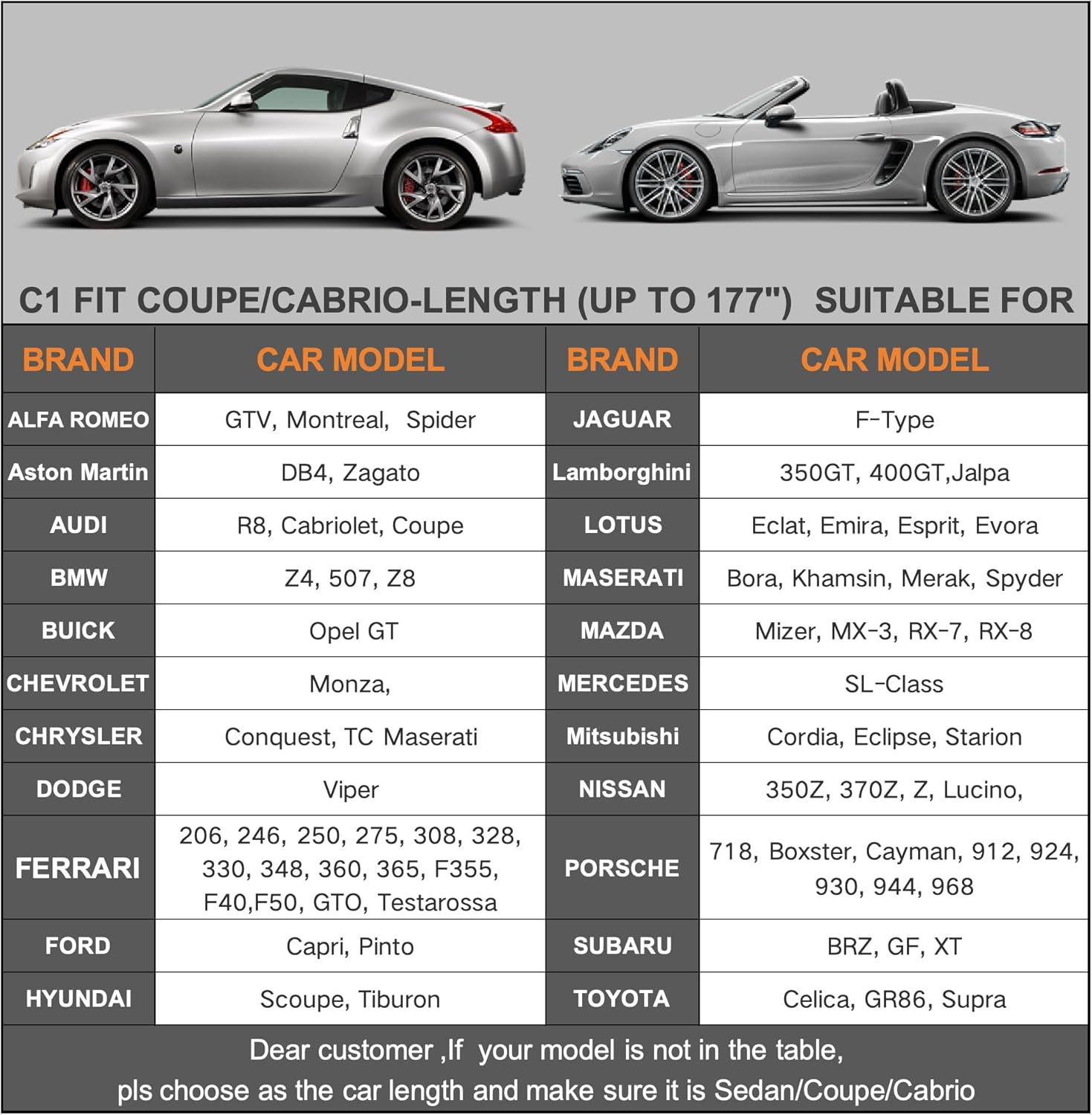 - ăDimension C1ăUniversal fit for Coupe/sedan which length is 177 inch (Not for hatchback and SUV). Suitable Porsche 718 Cayman Boxster, Nissan 350Z 370Z, Jaguar F Type, Subaru BRZ, Toyota 86, Etc.
