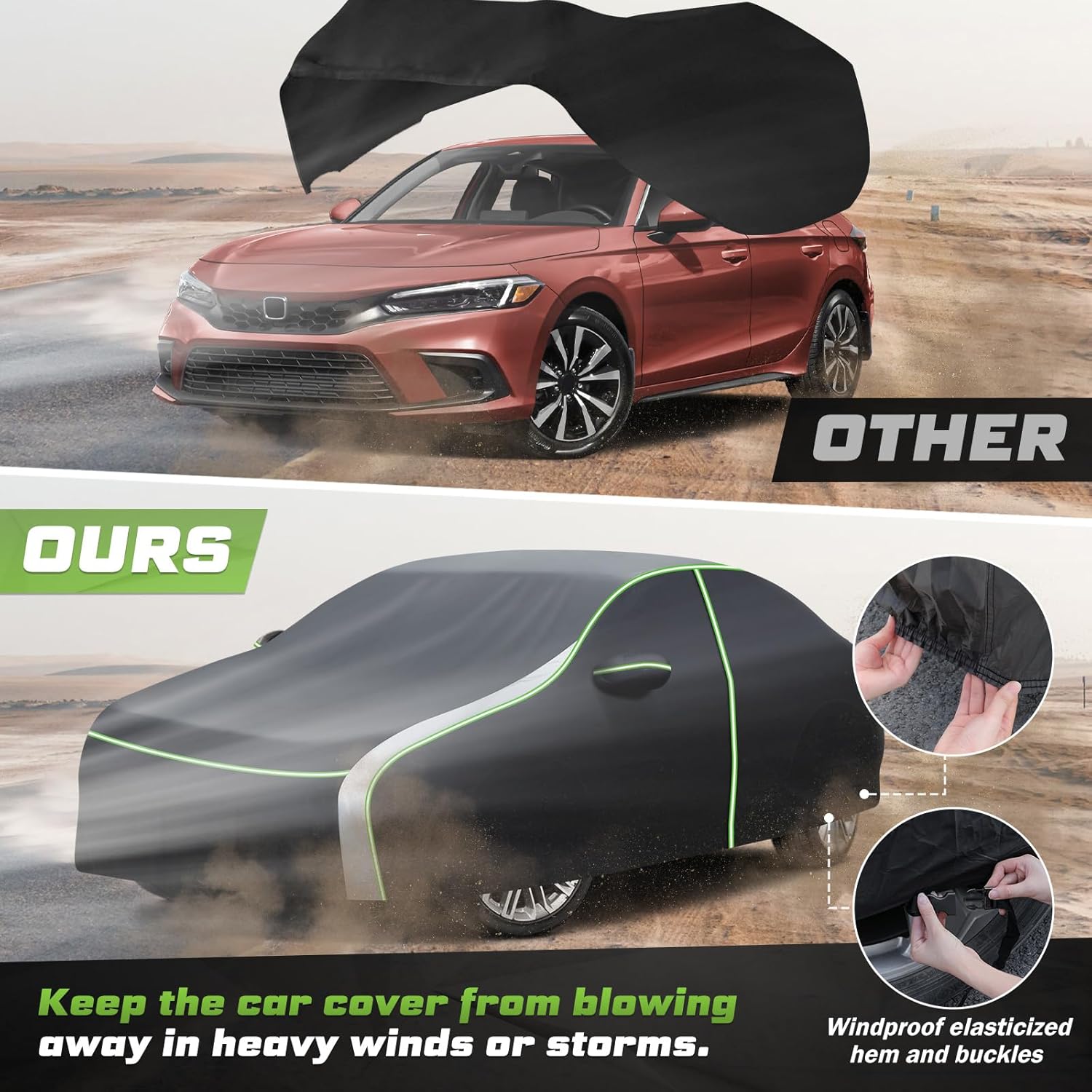 - Reflective Strips, Driver Door Zipper, Fixed Buckles: The reflective strips in the car cover enhance nighttime visibility and parking safety. Driver-side door zipper for easy and time-saving access to the interior. Windproof elasticized hem and 4 buckles secured to the wheels keep the car cover from blowing away on windy days.