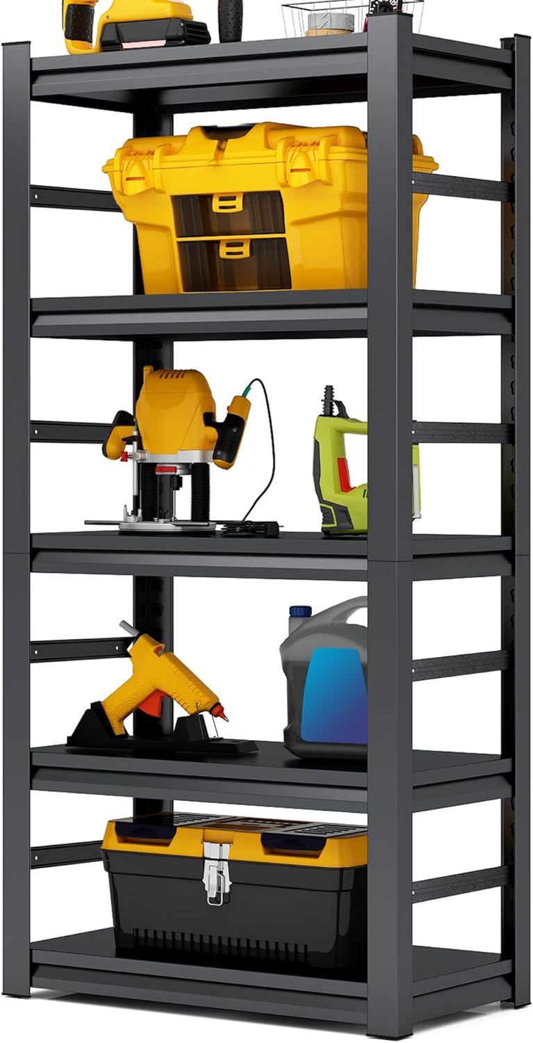 - ăHeavy Duty 5-Tier Storage Shelving Unită: Our garage storage shelves are made of solid & quality metal, which is more sturdy and tough than normal storage shelves. Featured with powder-coated smooth metal frame, this 5-tier shelving unit is corrosion and rust-resistant, can be sturdy and stable enough for long time using to organize heavy-duty stuff.