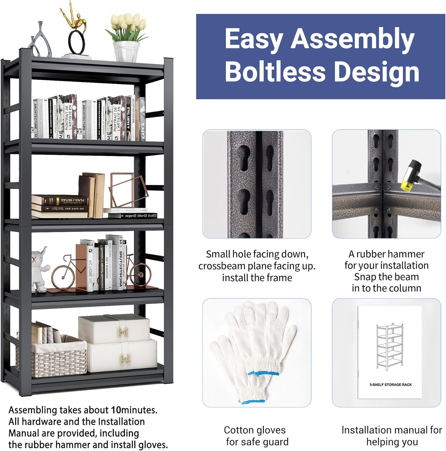 - ăEasy to Assembleă: There are no nuts or bolts required, so you can in stall this heavy duty garage storage shelf quickly, we offer a rubber mallet and a pair of gloves, please us the mallet to tighten the shelving rack. This garage shelving is also equipped with rubber footpads, which can protect the floor, add extra stability and avoid the shelving sliding accidentally.