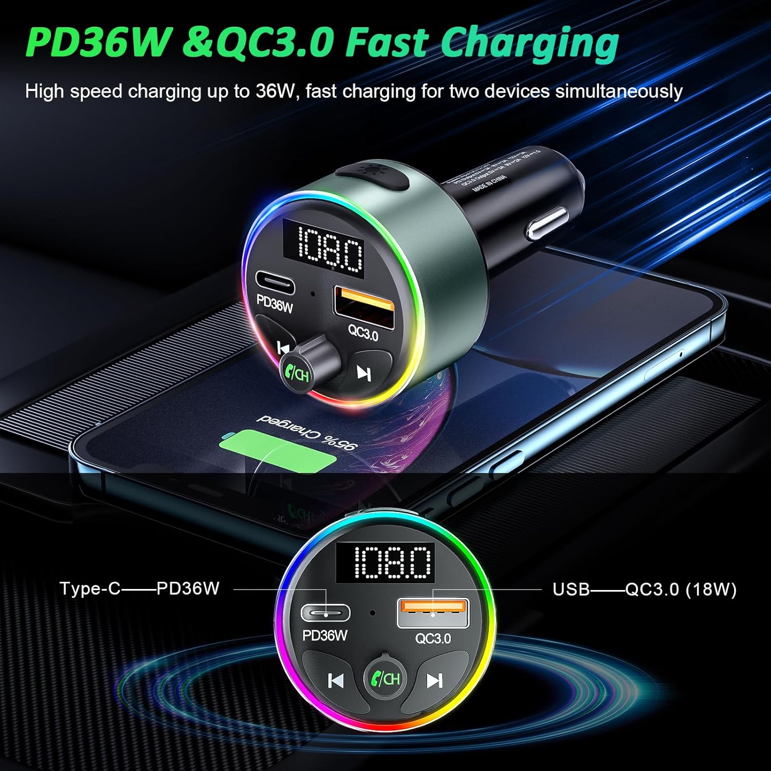FM Transmitter Bluetooth 5.3 - SOARUN Fast Car Charger Adapter 54W [PD 36W & QC3.0 18W], Support Wireless Radio, Aux 3.5mm, Hands-Free Calling with 9 Colors LED Backlit