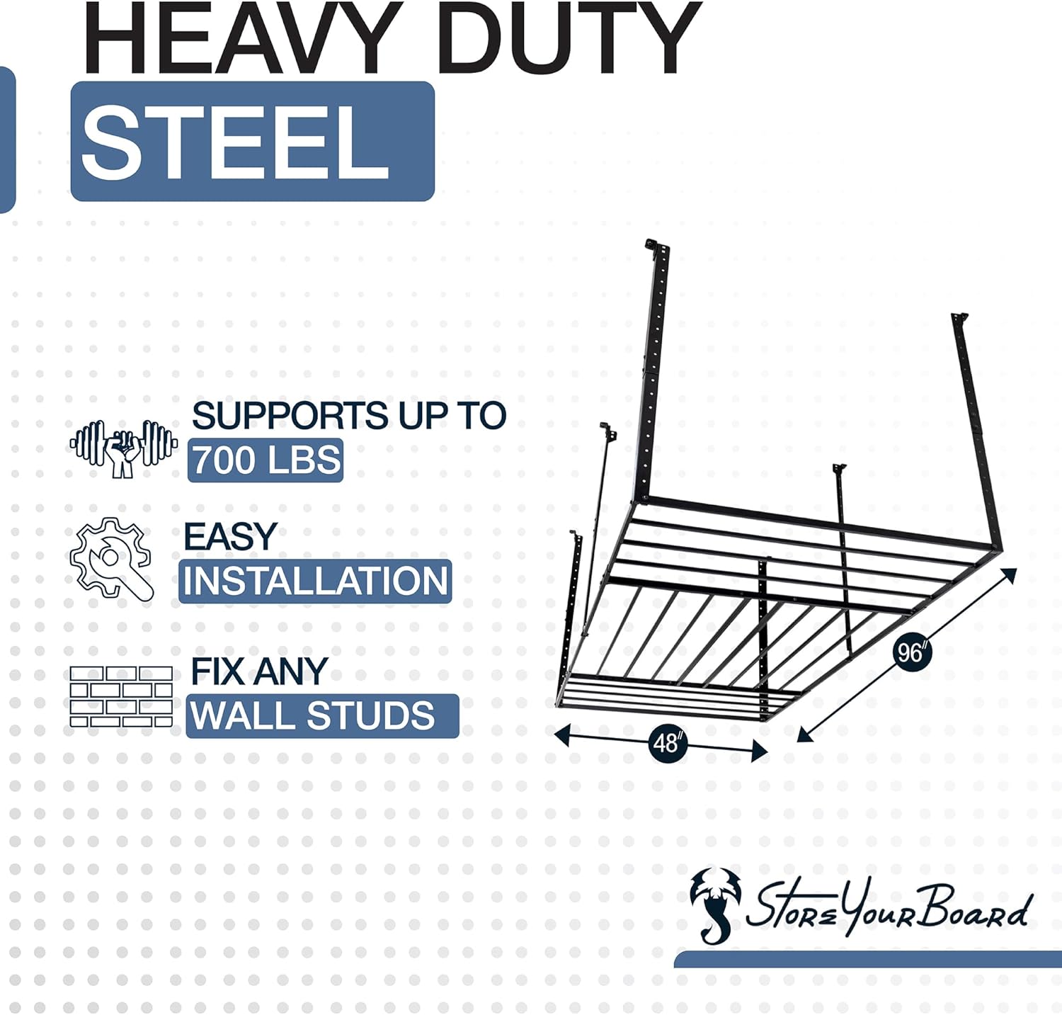 - Heavy Duty Steel: Solid alloy steel frame supports up to 700 lbs for secure garage overhead storage. Flat, sqaured tubing shelf provides more stability than traditional wire shelves.