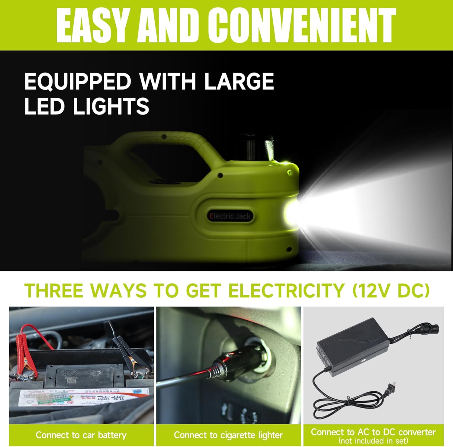 - [Update Dual-Pump & LCD]The 3-in-1 Electric Car Jack 5T has a built-in dual cylinder air pump and LCD touch screen. Powered by cigarette lighter, car battery or other 12V DC power source, fully auto, save time and energy compare with manual jack.
