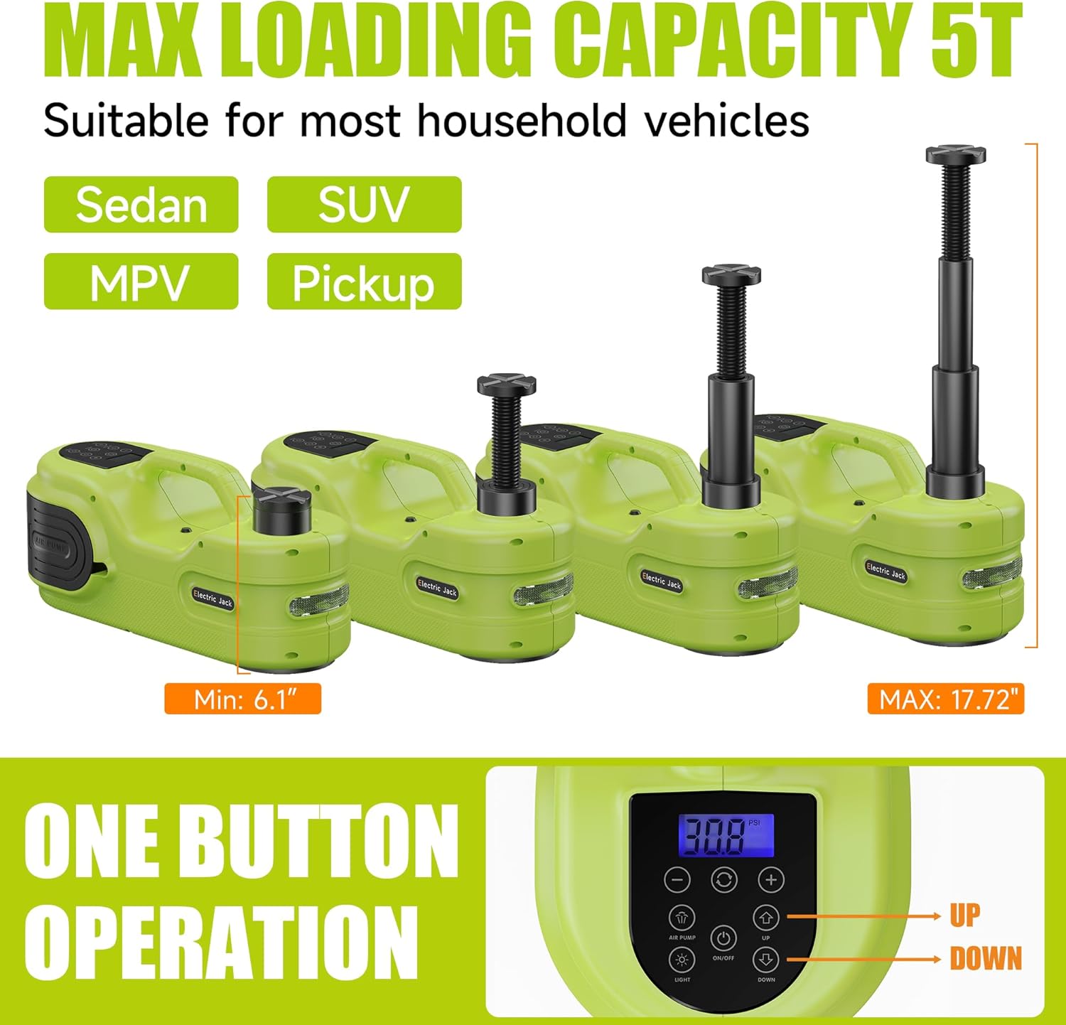 - [Powerful Car Jack] Electric Hydraulic jack can lift cars up to 5 tons and takes less than 2 mins to lift to its MAX height (lifting height range:6.1-17.72 inch), suitable for most vehicles. Featuring an intuitive touch-screen button for one-touch operation