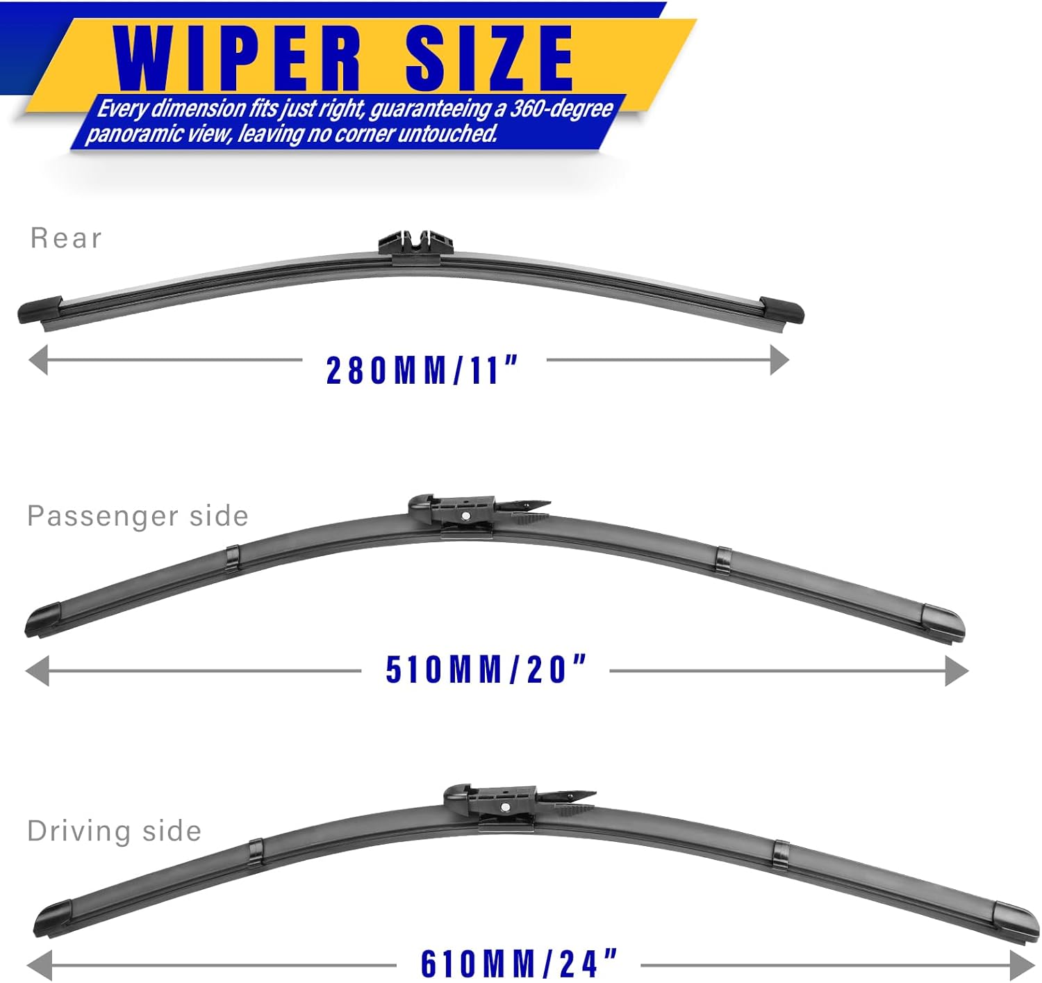 - ăWORRY-FREE SHOPPINGă 3Pcs wiper blades 24"+20"+11" and Instruction Manual. One Year warranty! Refund or return anytime in one year, Long life, smooth engagement.